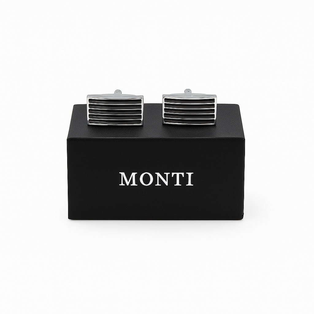 Elevate your formal look with these sleek cufflinks from Monti. Crafted in polished silver-tone metal, they feature a modern rectangular face with elegant horizontal stripe detailing for a clean, structured aesthetic. Designed for double-cuff or French-cuff shirts, they include a toggle back for secure wear and sit neatly at the wrist for understated ambition. Whether you’re heading to a wedding, a business meeting or a night out, these cufflinks add a refined touch of style.