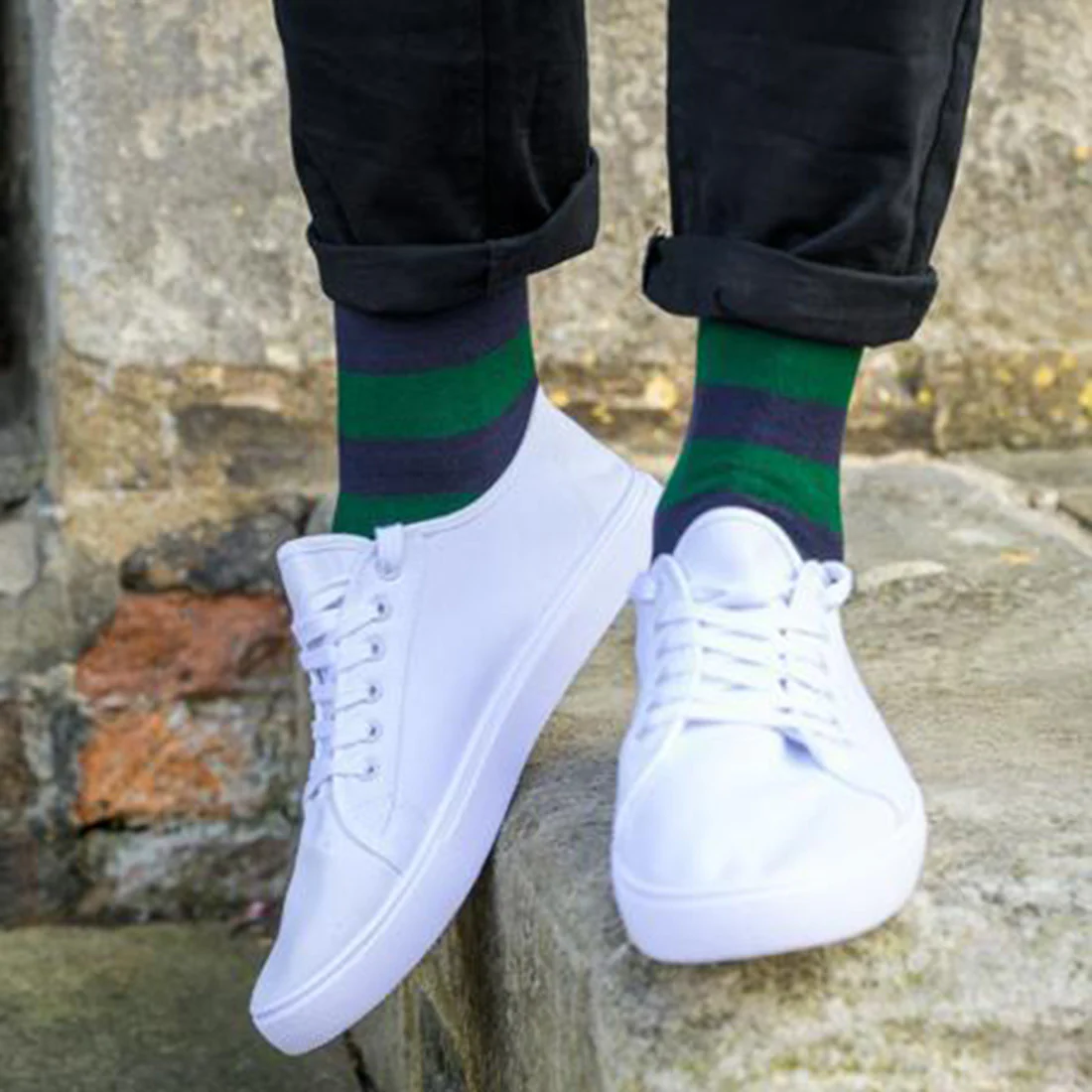 Compliment your outfit with this pair of striped bamboo socks. Covered in lines of racing green and navy, the shades are muted for a subtler look. They are knitted from our unique breathable bamboo blend creating an unbelievably smooth, snug feel.