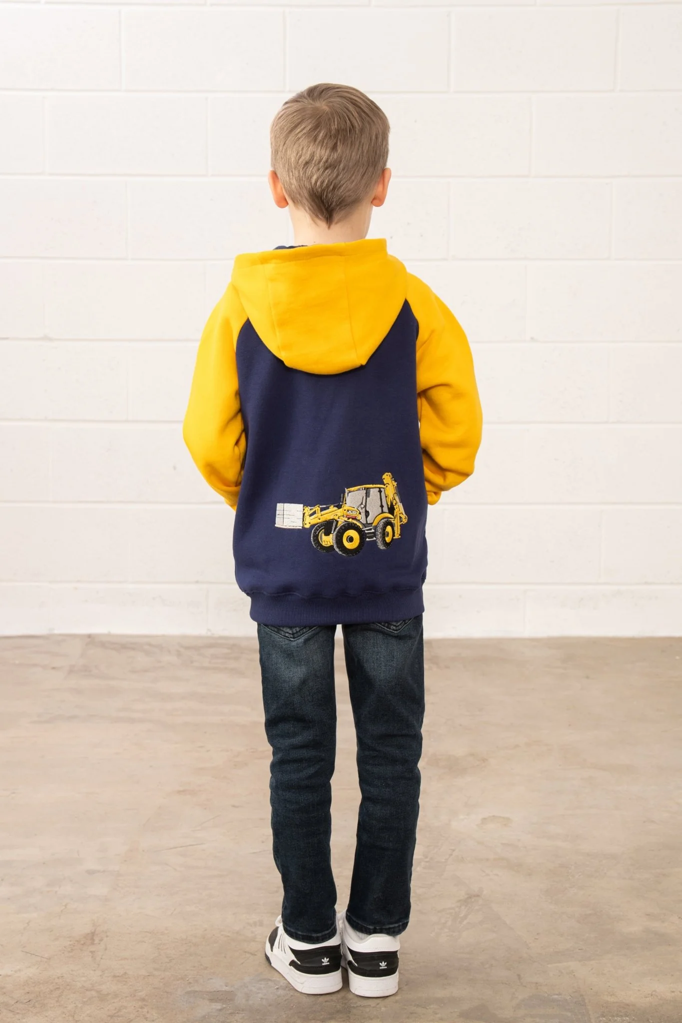 Featuring bold hand-drawn JCB tractor artwork, contrasting yellow and navy panels, and practical details like waist pockets and a sturdy front zip, this hoodie is as stylish as it is functional.