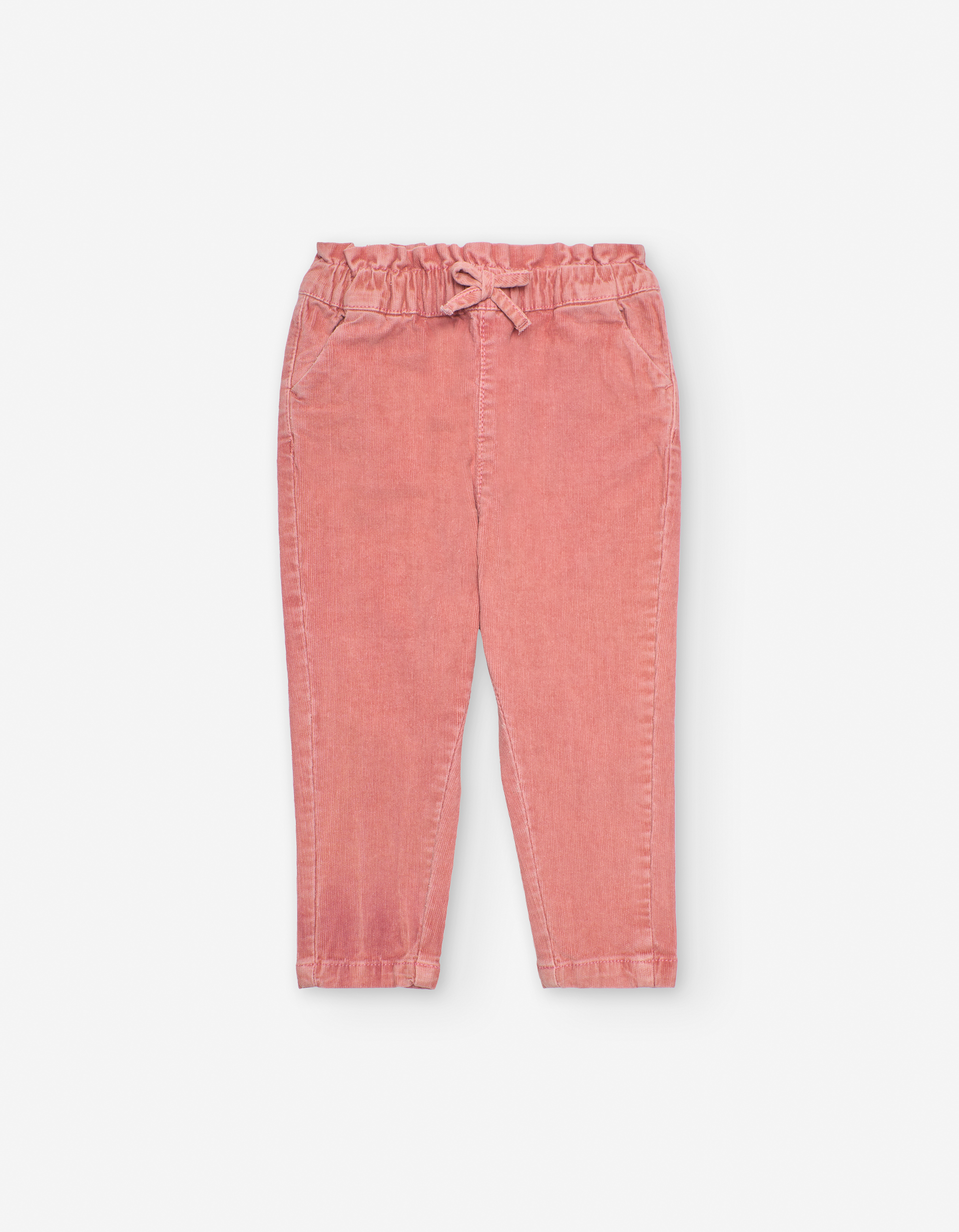 Pink corduroy trousers for baby girls, made from cotton with a touch of stretch for added comfort and freedom of movement. Paperbag waist with a decorative bow, adjustable on the inside with elastic and buttons. Side pockets and back pockets. Straight fit. A versatile option, perfect for autumn-winter looks.