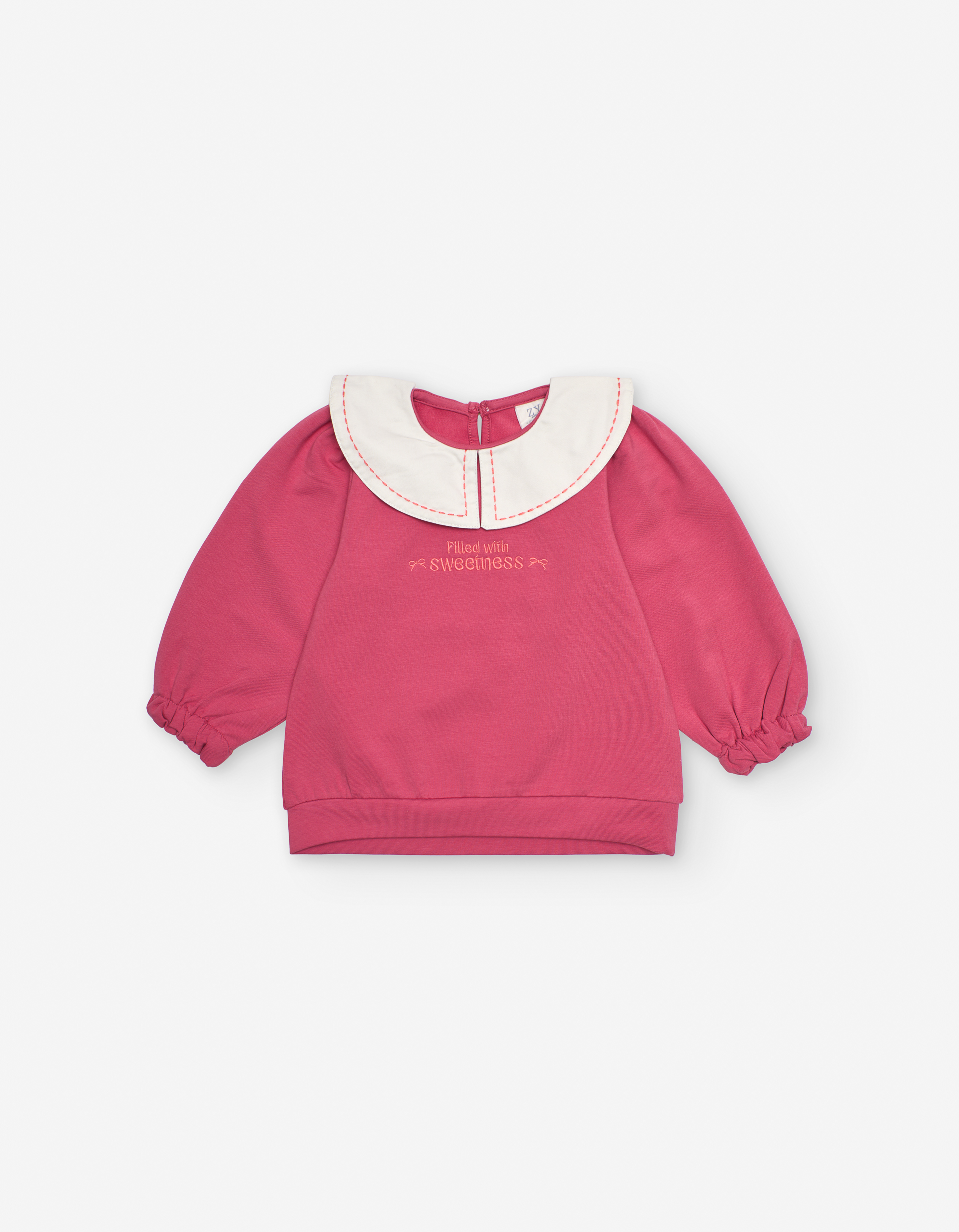 Pink sweatshirt for baby girls, in cotton with a touch of stretch for greater comfort and freedom of movement. White Dutch collar. Front embroidery. Slightly puffed sleeves, with gathered shoulders and wavy elastic cuffs. Button at the back for easy dressing. A comfortable and feminine option!
