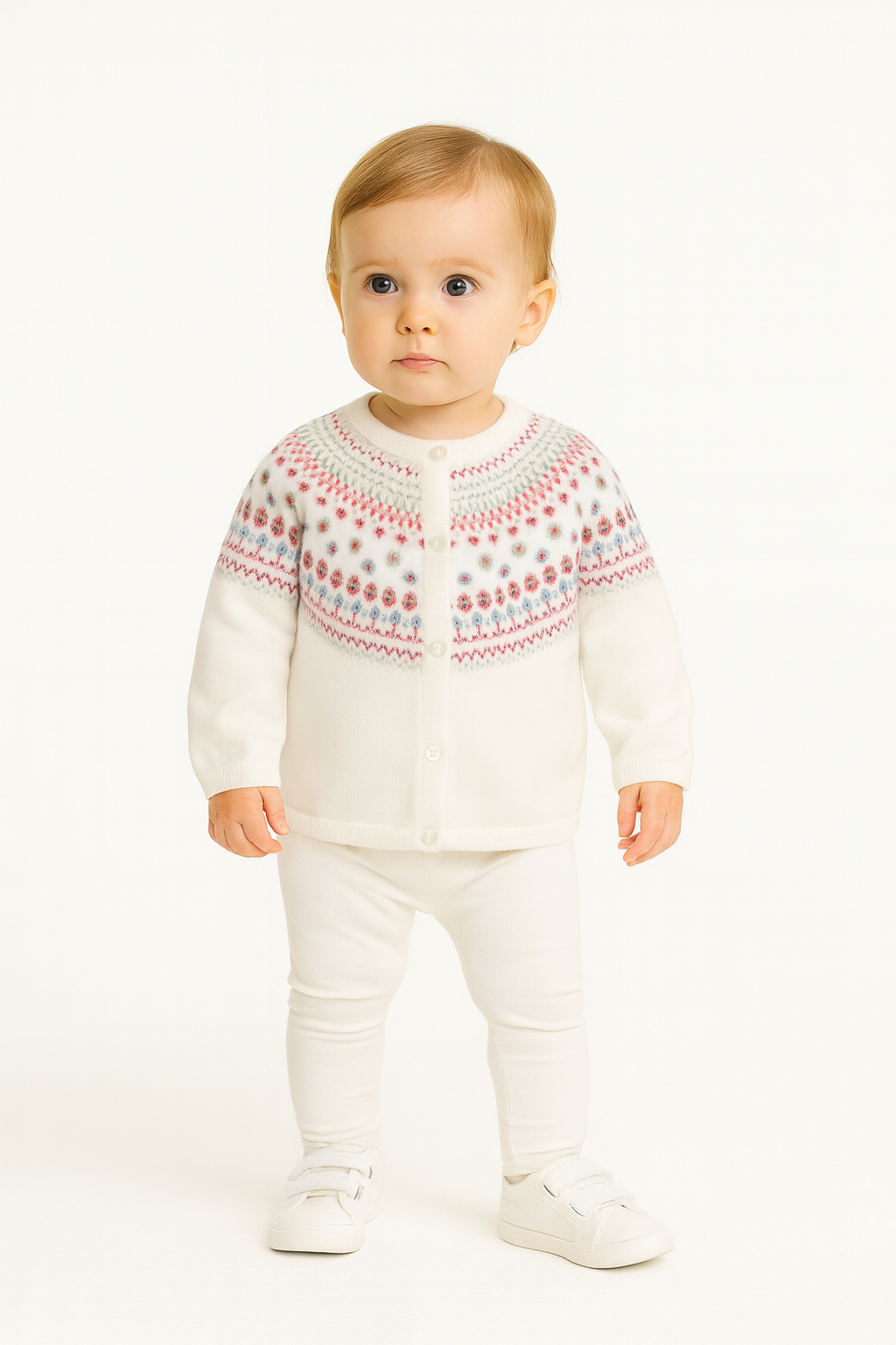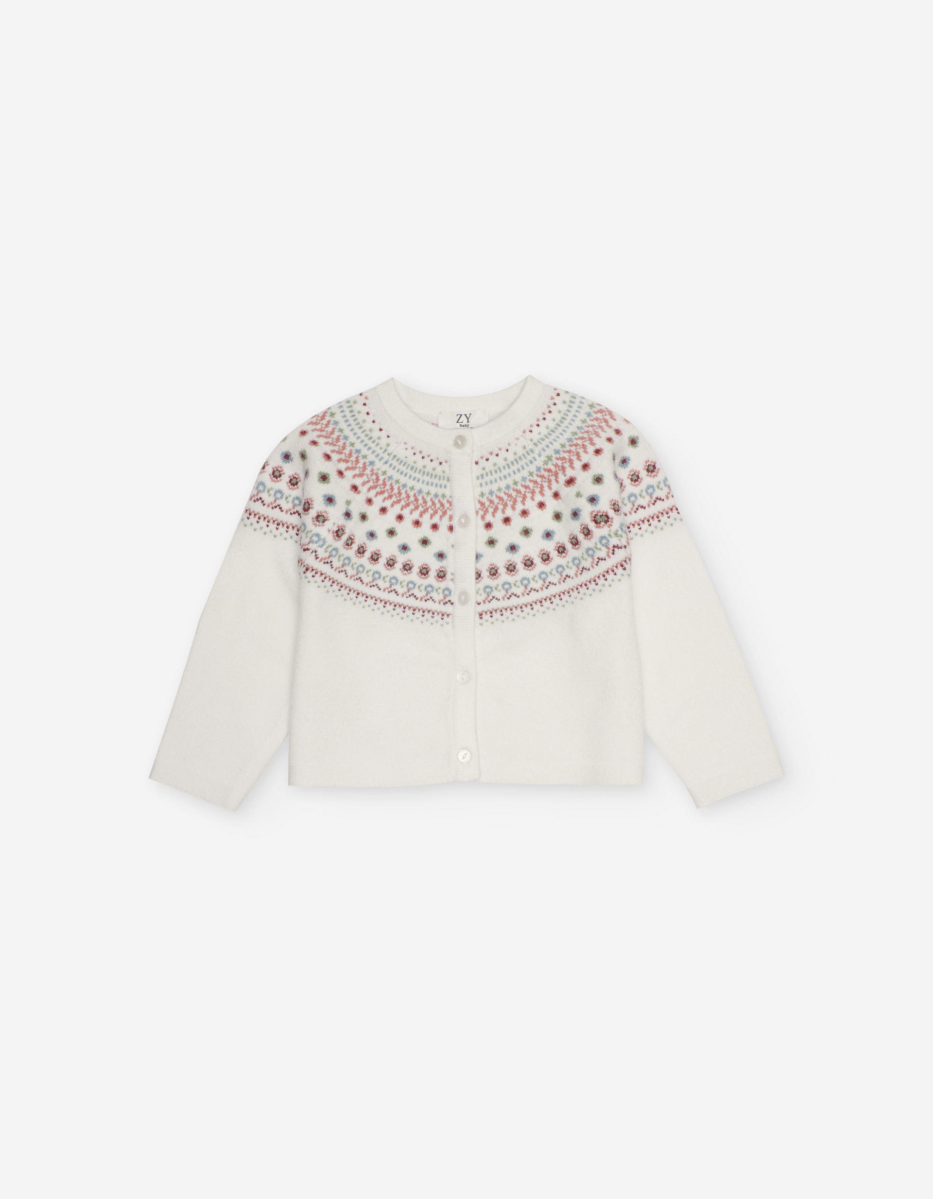 White knitted cardigan for baby girls from the Zippy collection, with multicolour jacquard on the chest and around the shoulders. A-line fit. A soft and cosy garment with a traditional touch.