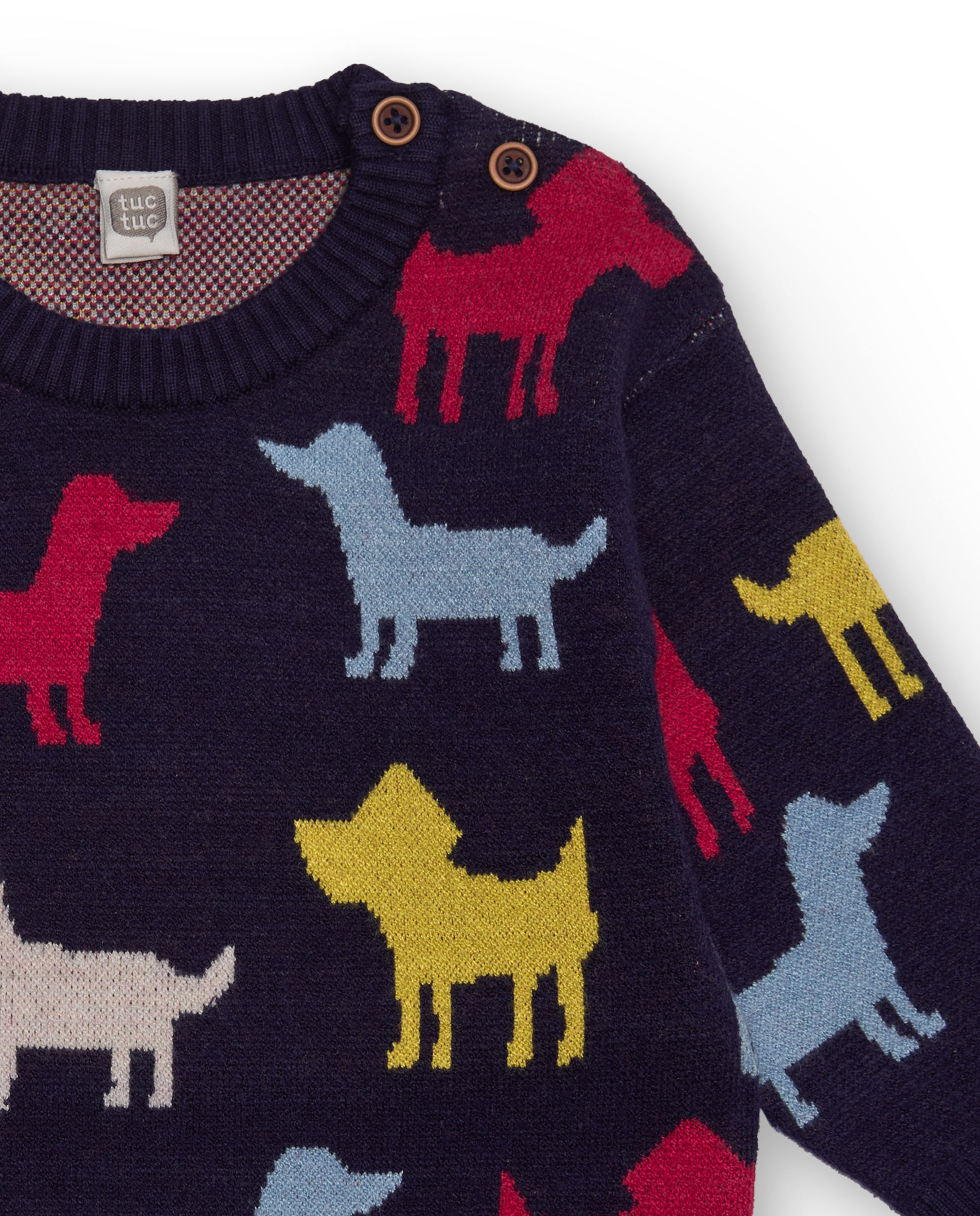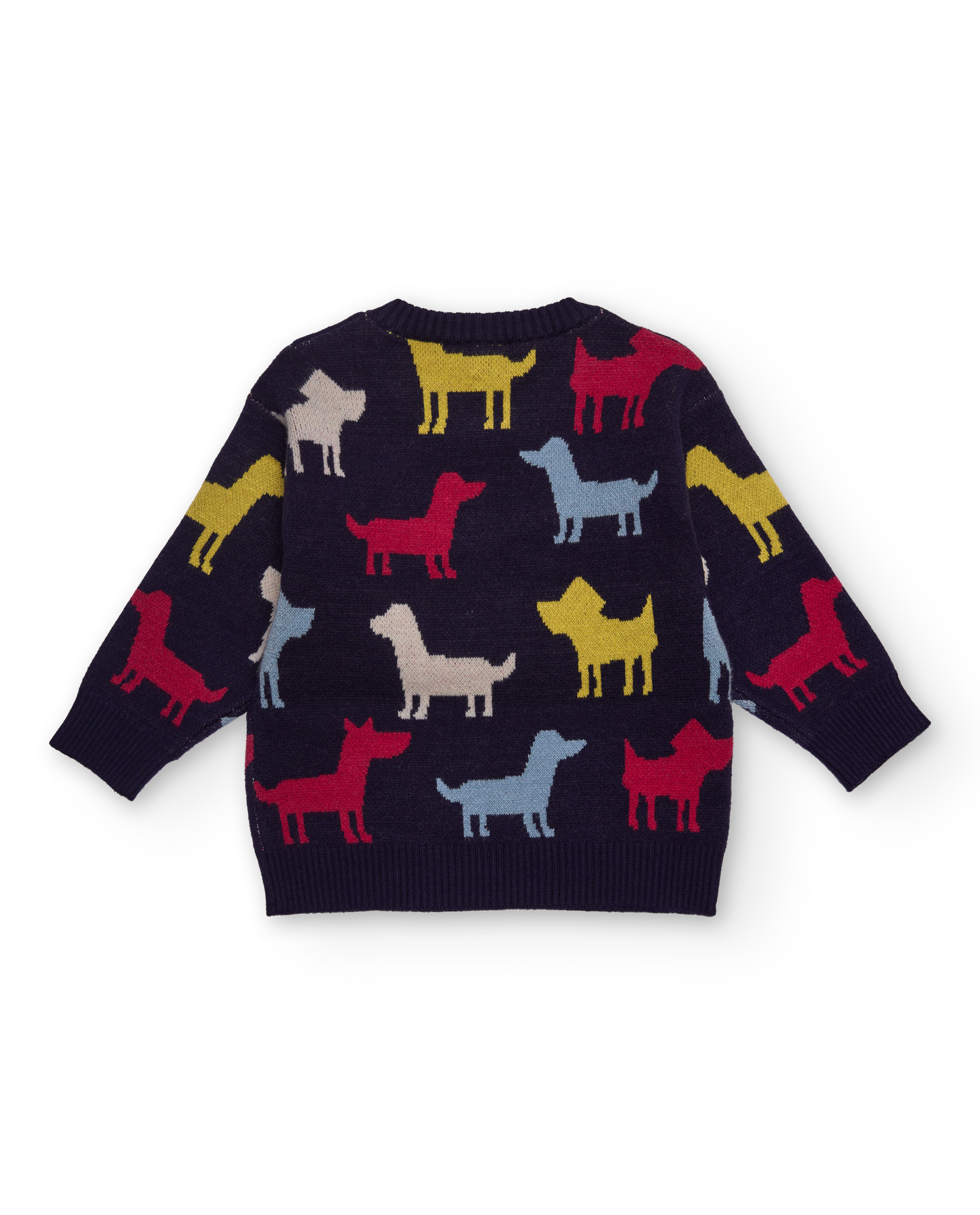 Soft knit sweater for boys in navy blue featuring an all-over print of colourful dog silhouettes. Crew neck with shoulder button closure for easy dressing. A playful and comfy piece for everyday wear.