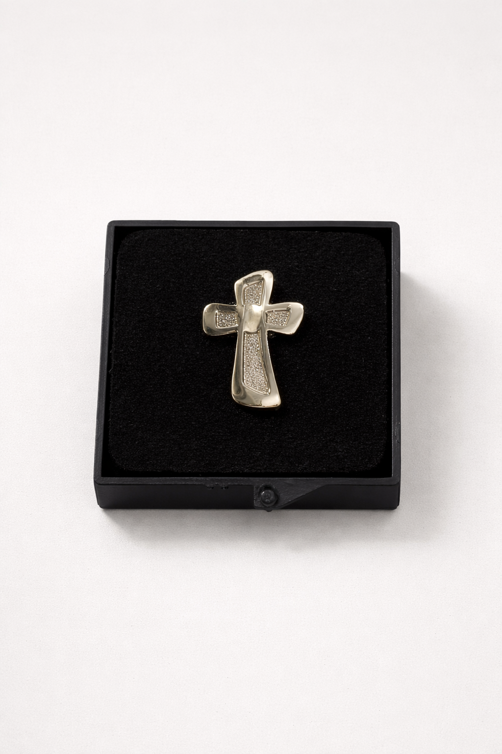 Polished cross pin badge with textured detail, ideal for communion, confirmation or meaningful religious gifts.