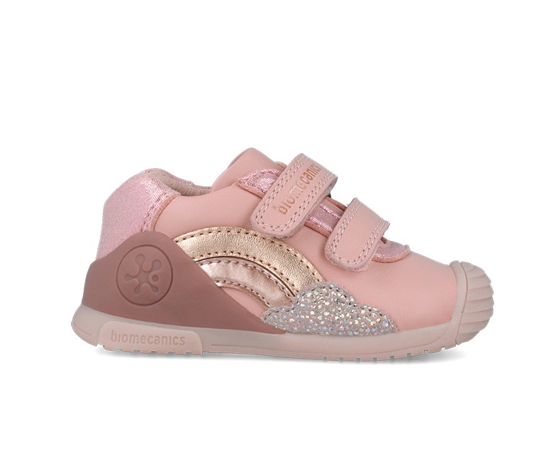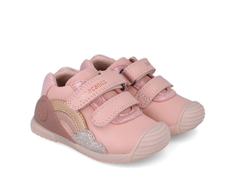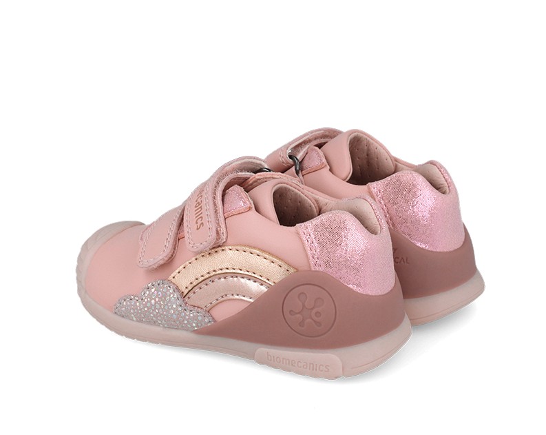 The Biomecanics Girls’ First Steps Shoe in pink is designed to support toddlers as they learn to walk with confidence. Featuring a playful rainbow and glitter cloud detail on the side, these shoes bring fun and sparkle to every step.
