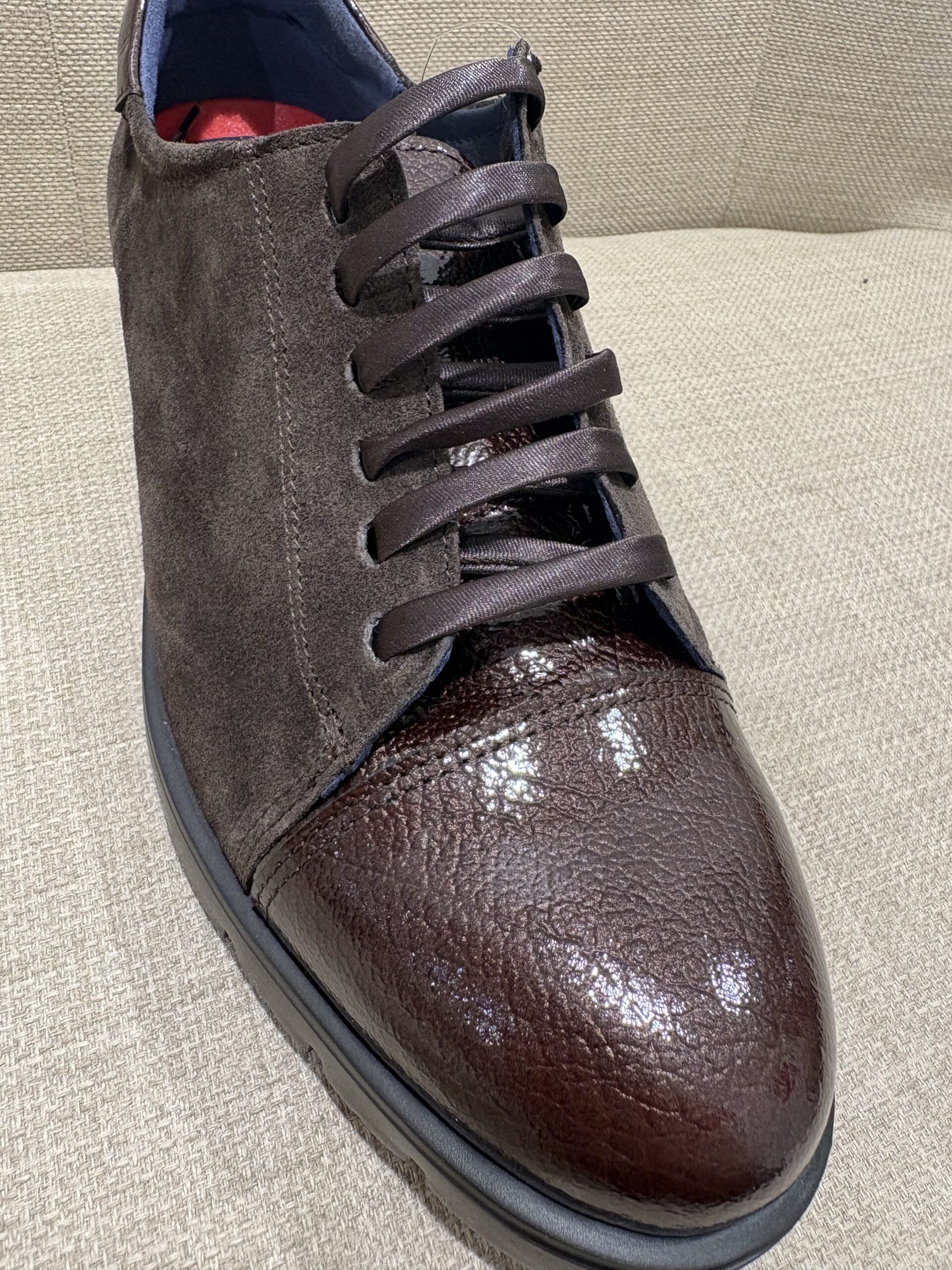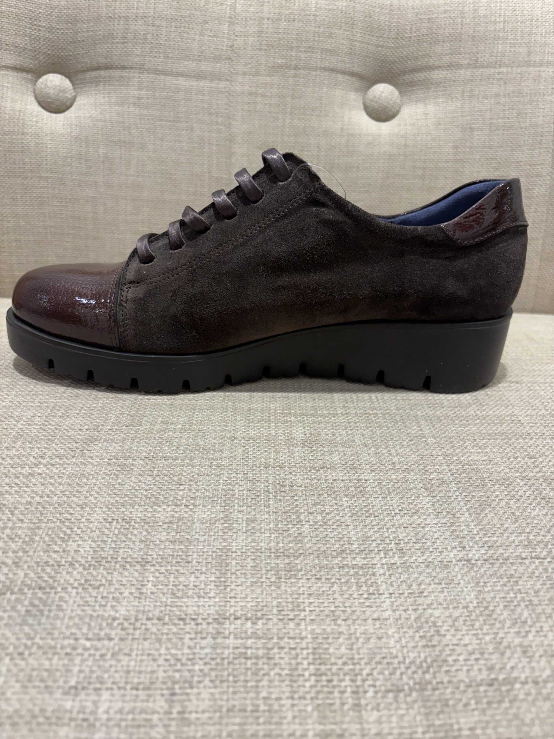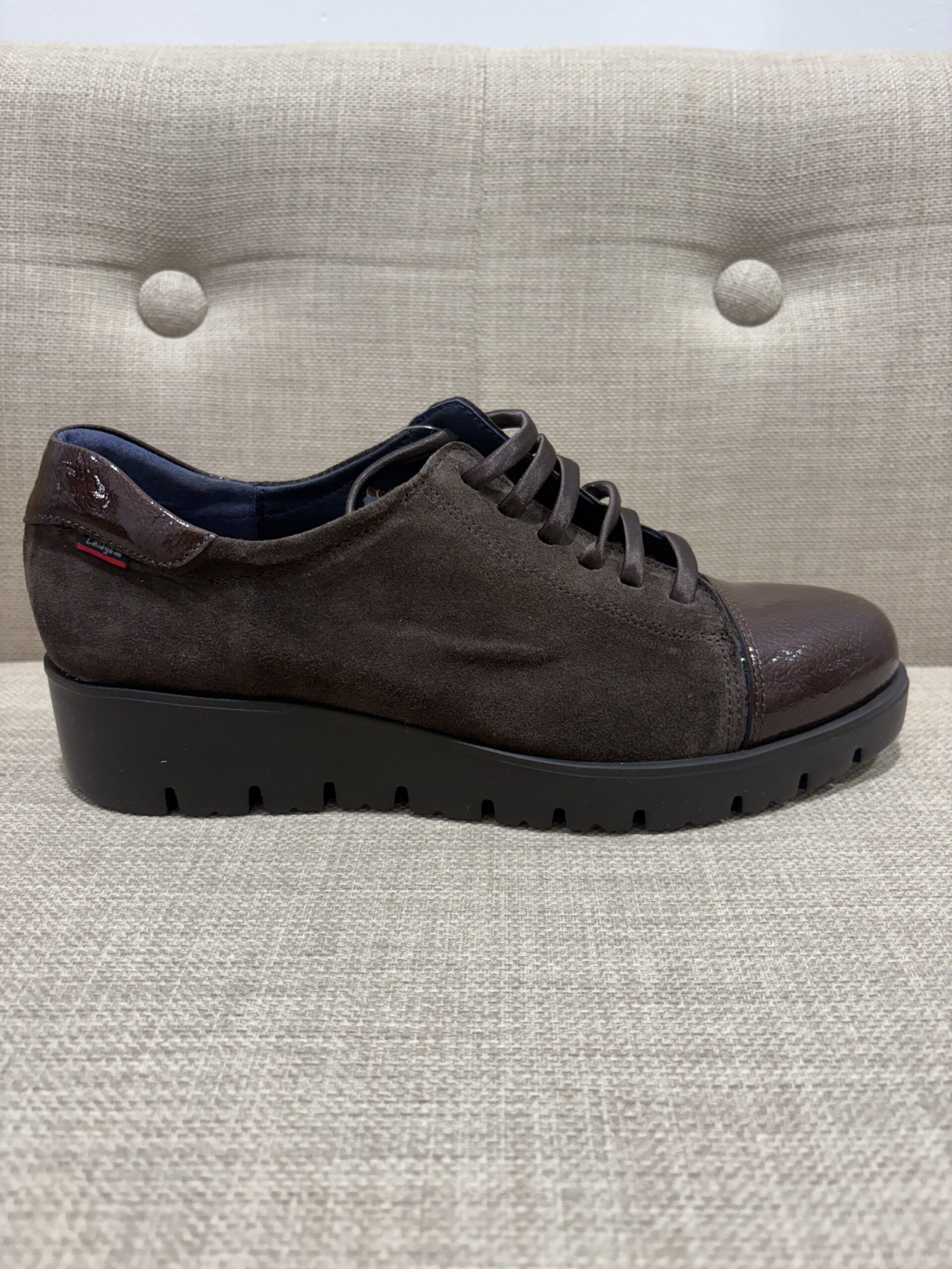 This is a brown wedge shoe from Callaghan. It combines soft suede with glossy leather details at the toe and heel for a stylish contrast. The shoe features elastic-style laces for a snug, easy fit and a lightweight platform sole that provides comfort and flexibility. Perfect for all-day wear, it offers a modern look that pairs well with both casual and smart outfits.