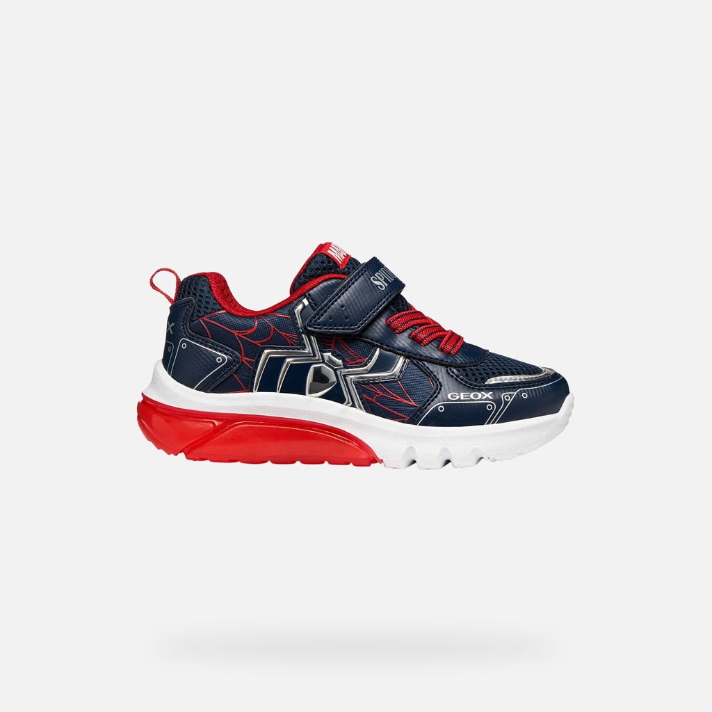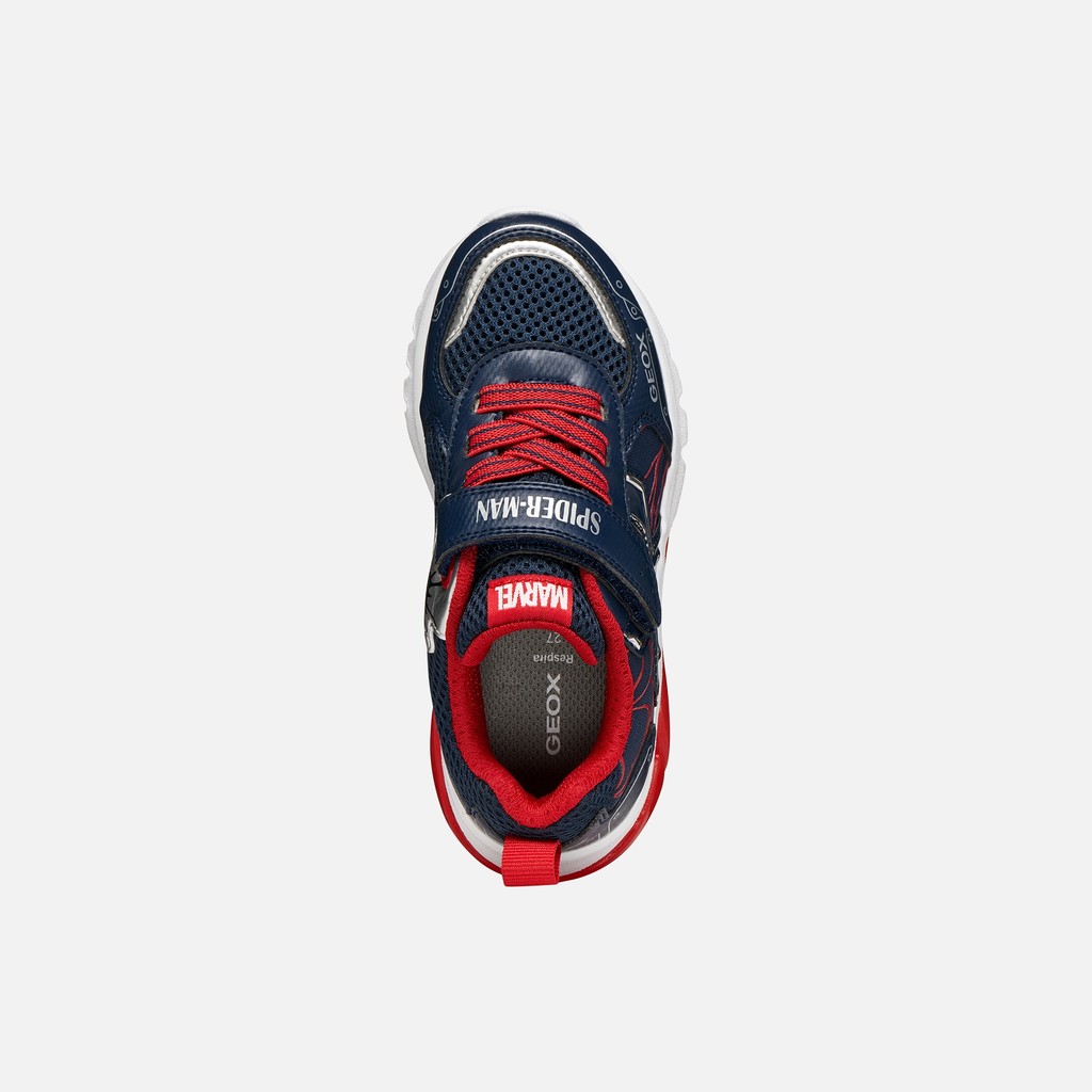 Boys trainers with an active and modern look, the result of a collaboration between Geox and Warner Bros. Made in a combination of navy blue and red, they feature a mesh upper and embossed leather with graphics dedicated to the superhero Spider-Man. Ciberdron has lights integrated into the outsole, adding a touch of fun to sports looks for school and leisure.
