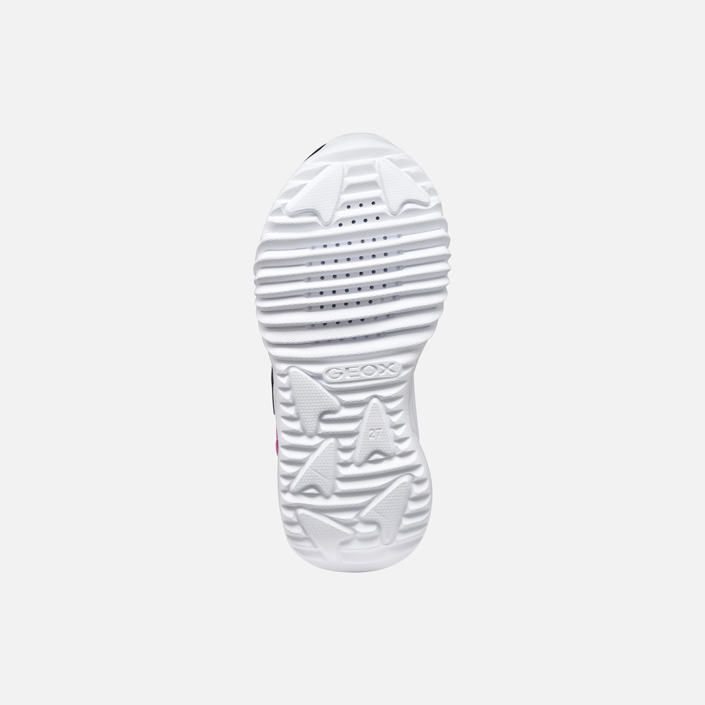 Girls trainer from Geox in running style, cushioned and comfortable. In this blue version with multicoloured inserts, Assister has an upper that is perfect for brightening up sports and school looks. Made from shiny printed fabric and patent-effect material, it features lights integrated into the outsole to light up the fun with every step.
