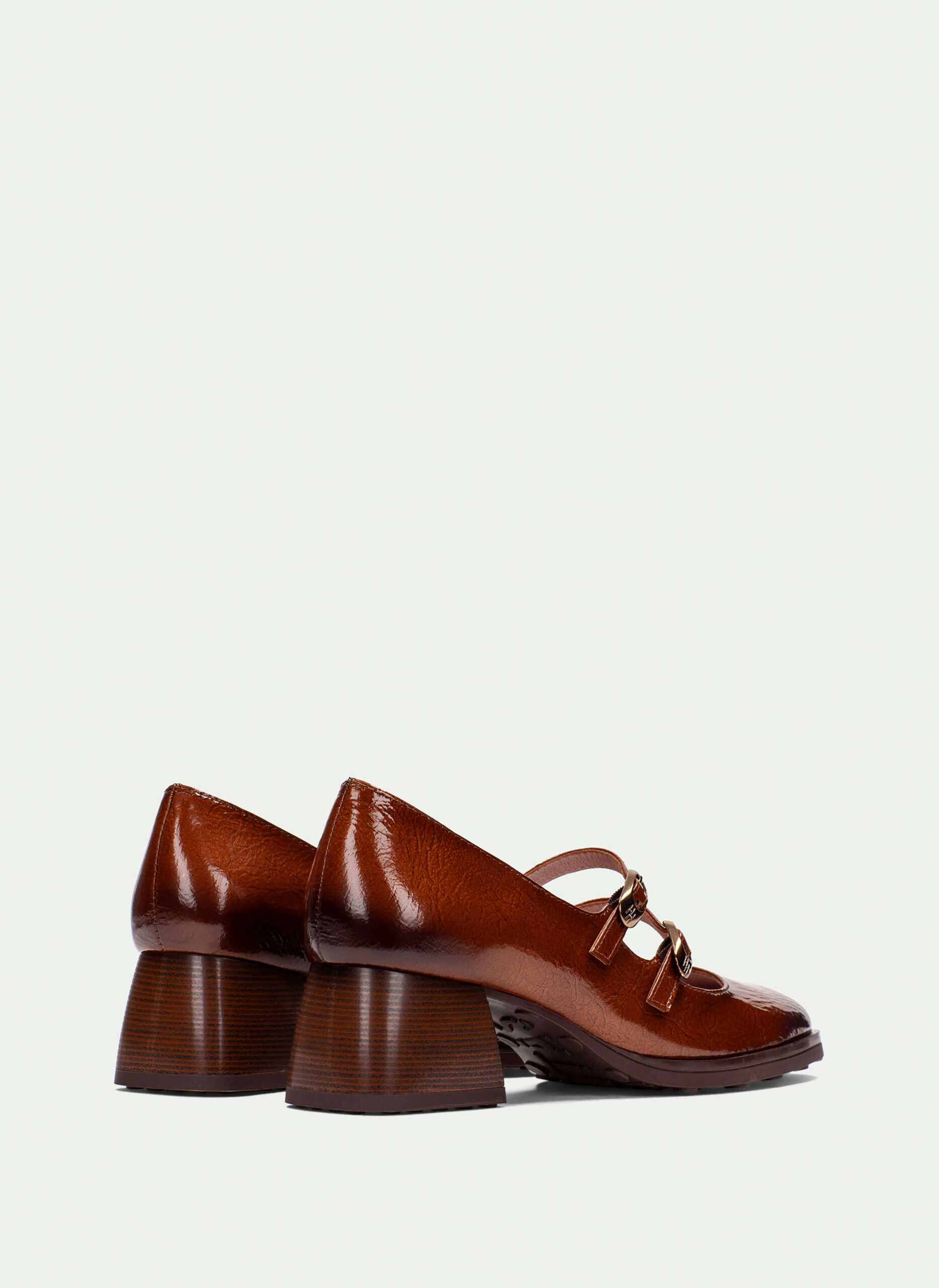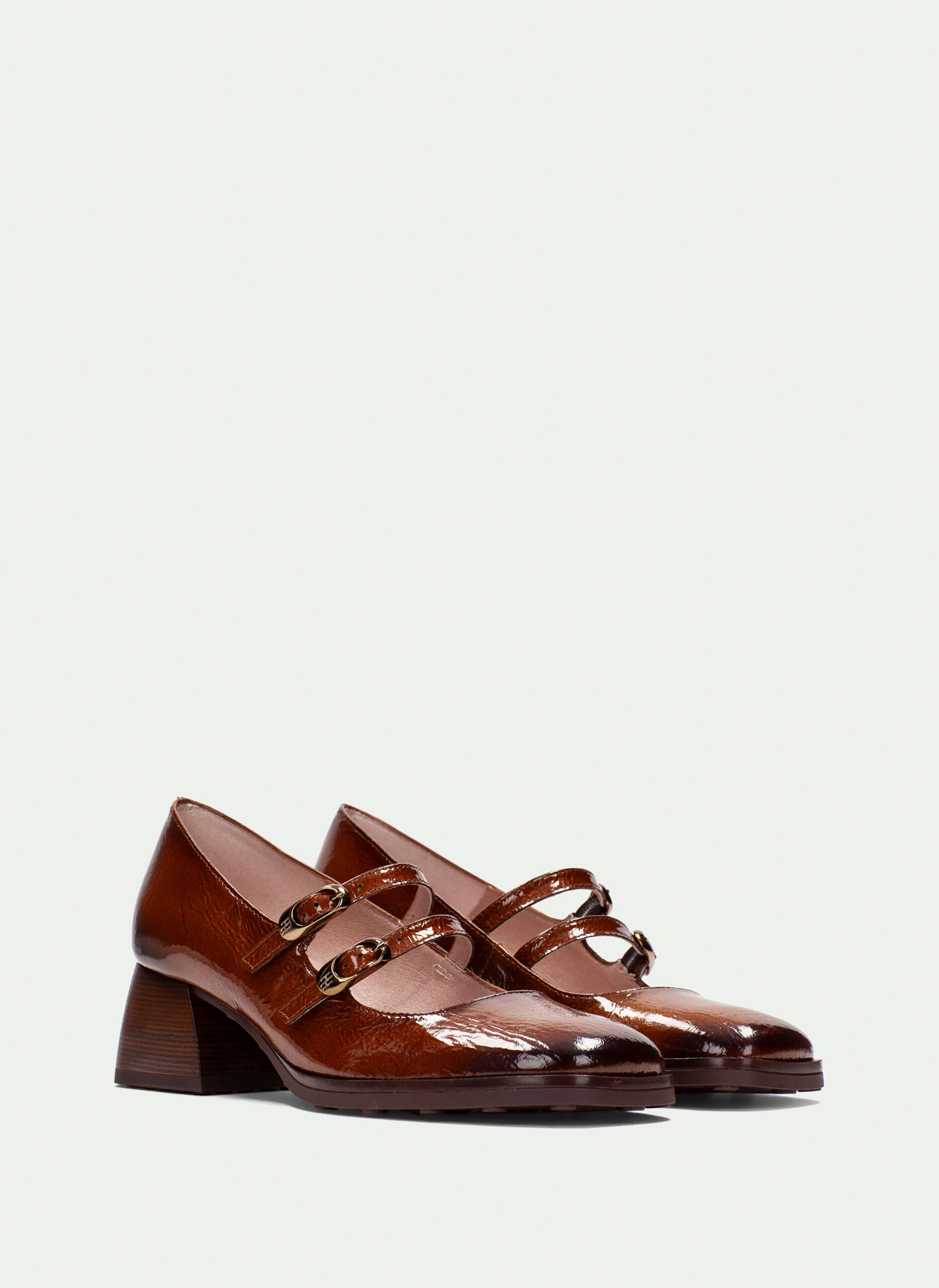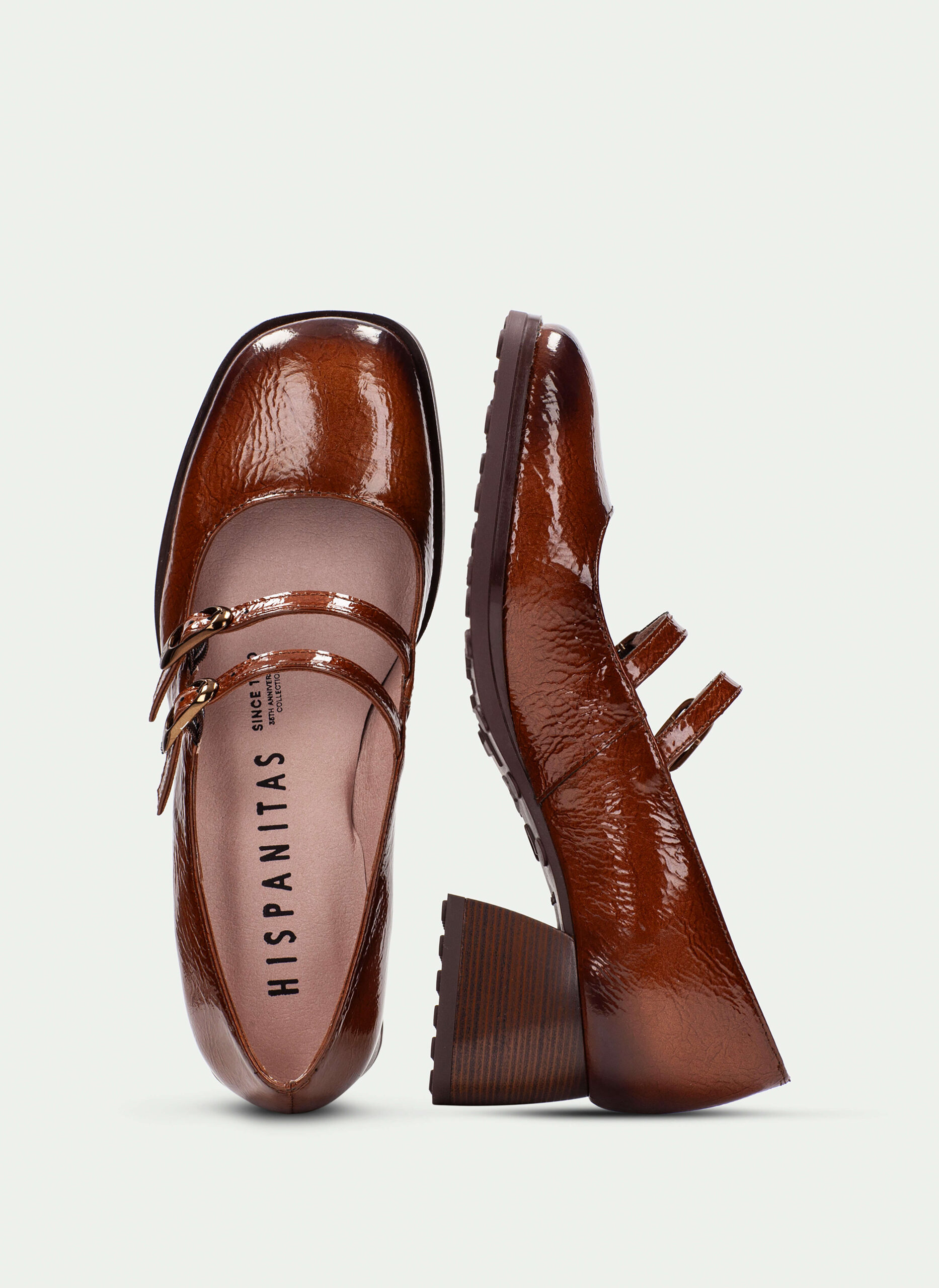 Step into timeless elegance with the Hispanitas Mary Janes in tan patent leather. Featuring a chic double strap design and a classic block heel, these shoes combine vintage-inspired style with modern comfort.