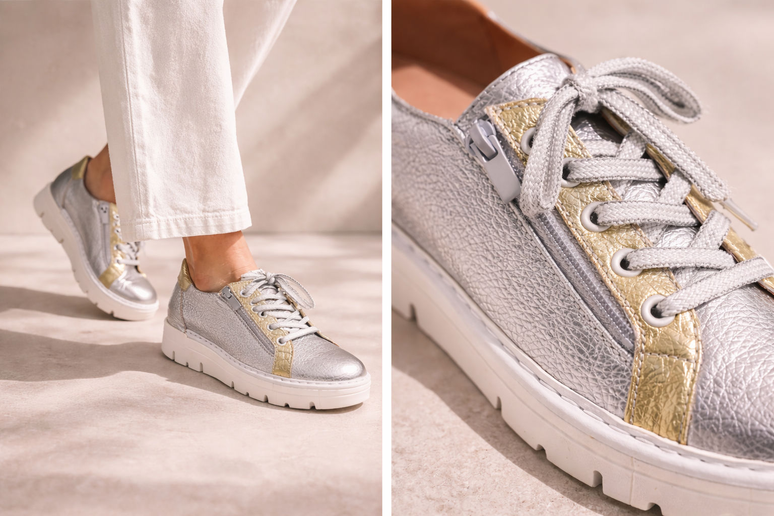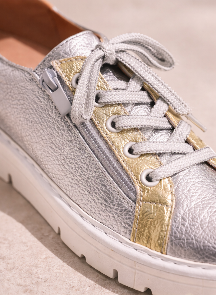Add a touch of shine to everyday outfits with these metallic lace-up trainers. Designed with a stylish silver textured upper and gold contrast panels, these trainers bring a modern, eye-catching finish to casual looks. The classic lace-up front ensures a secure fit, while the side zip fastening allows for easy on and off.