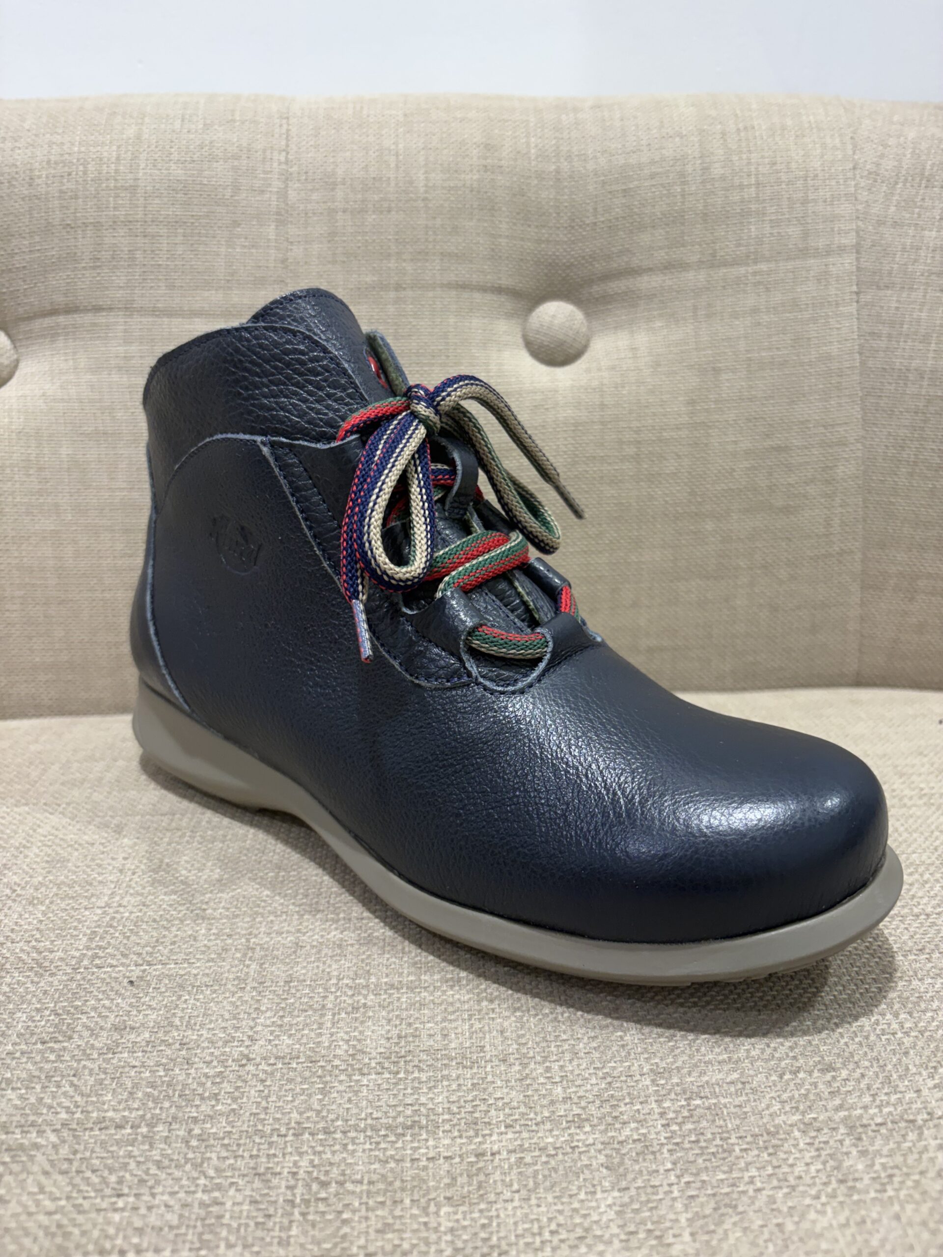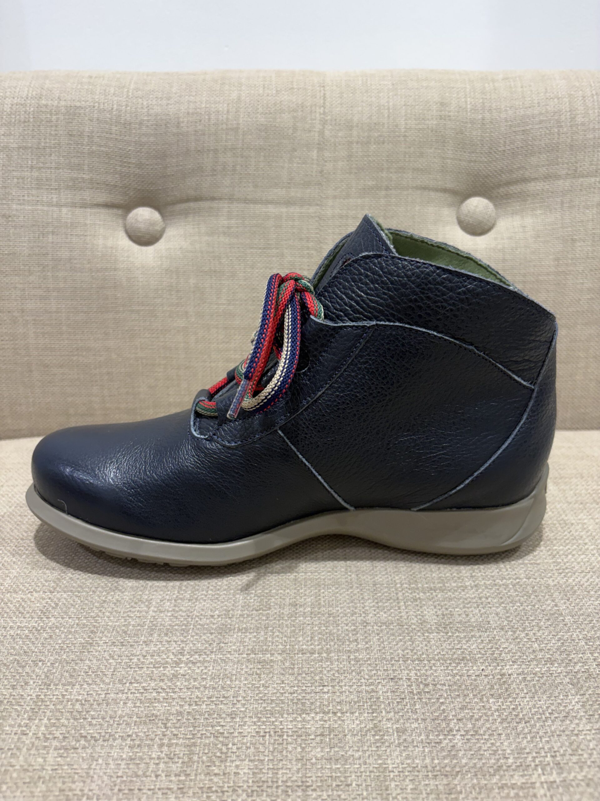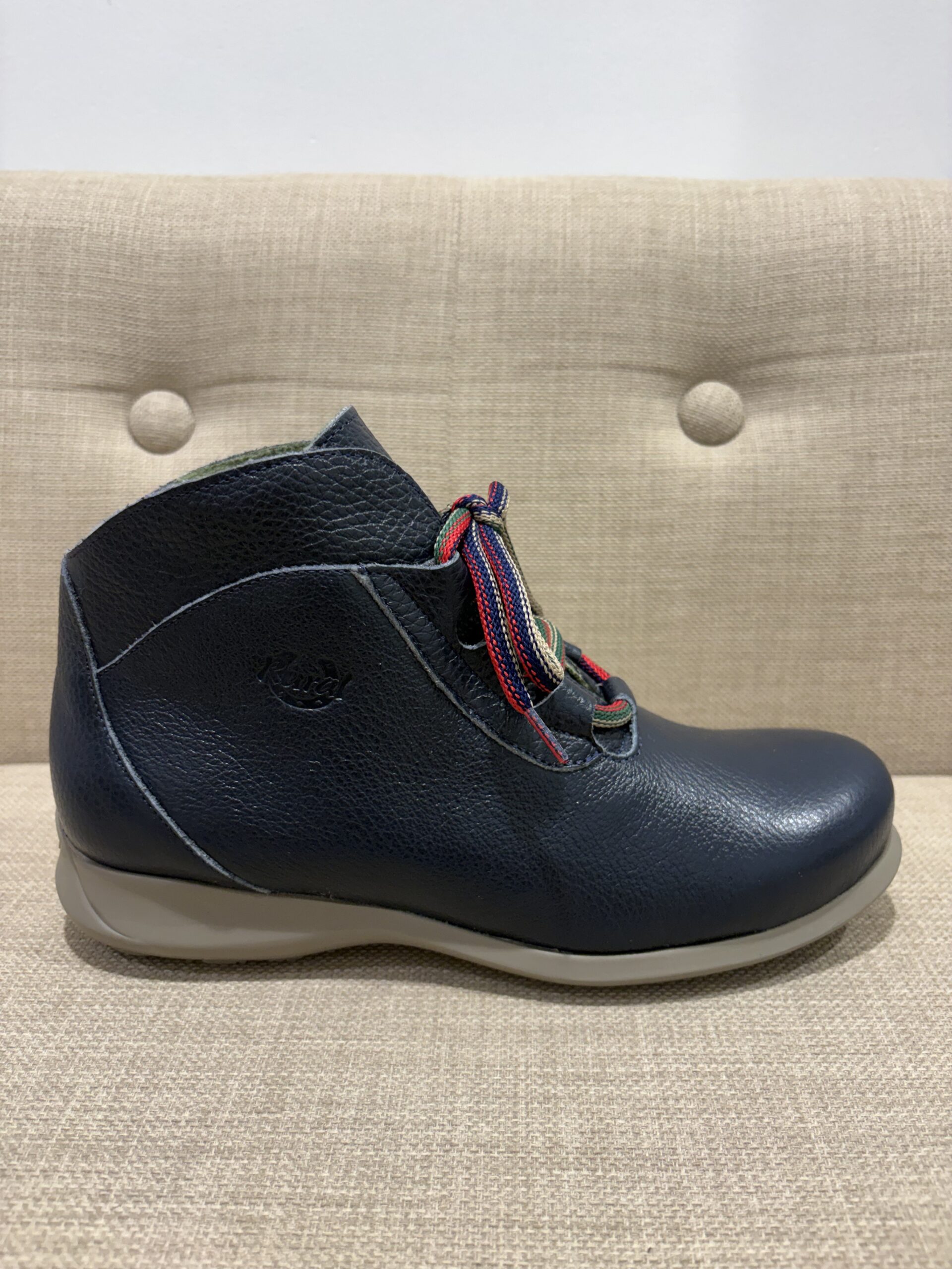 This is a navy blue leather ankle boot from Jose Saenz. It features a soft textured finish with colourful laces that add a fun and unique touch. The light grey sole gives good grip and comfort, making it perfect for everyday wear. The boot has a relaxed, casual style that pairs well with jeans or trousers for an easy, modern look.