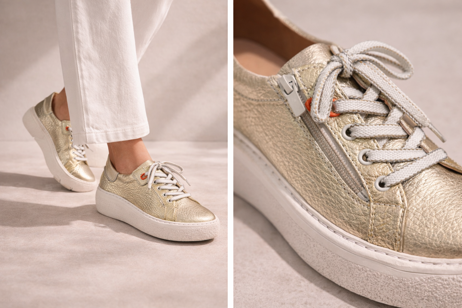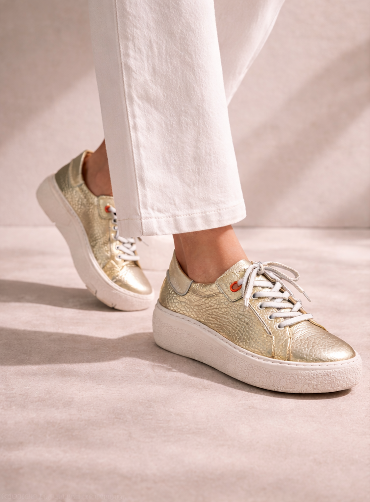 Step out in style with these metallic gold lace-up trainers, designed to add a touch of shine to your everyday look. The textured gold upper creates a modern statement, while the classic lace-up fastening ensures a comfortable and secure fit. A practical side zip allows for easy on and off, combining convenience with contemporary style.
