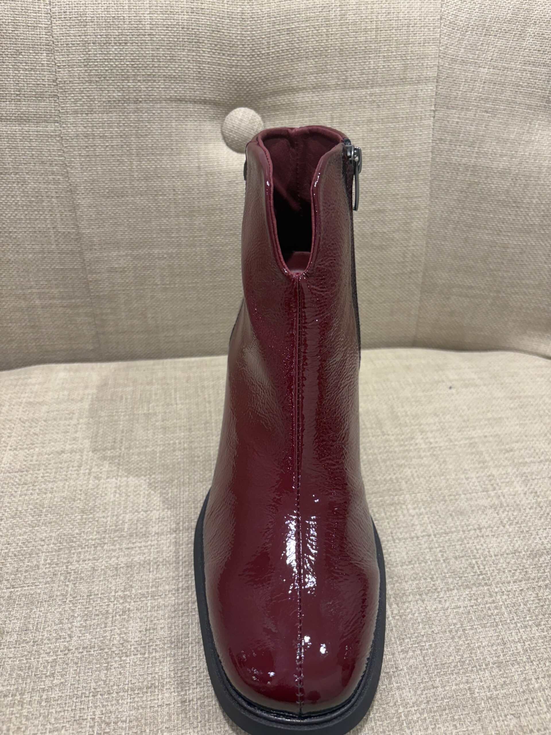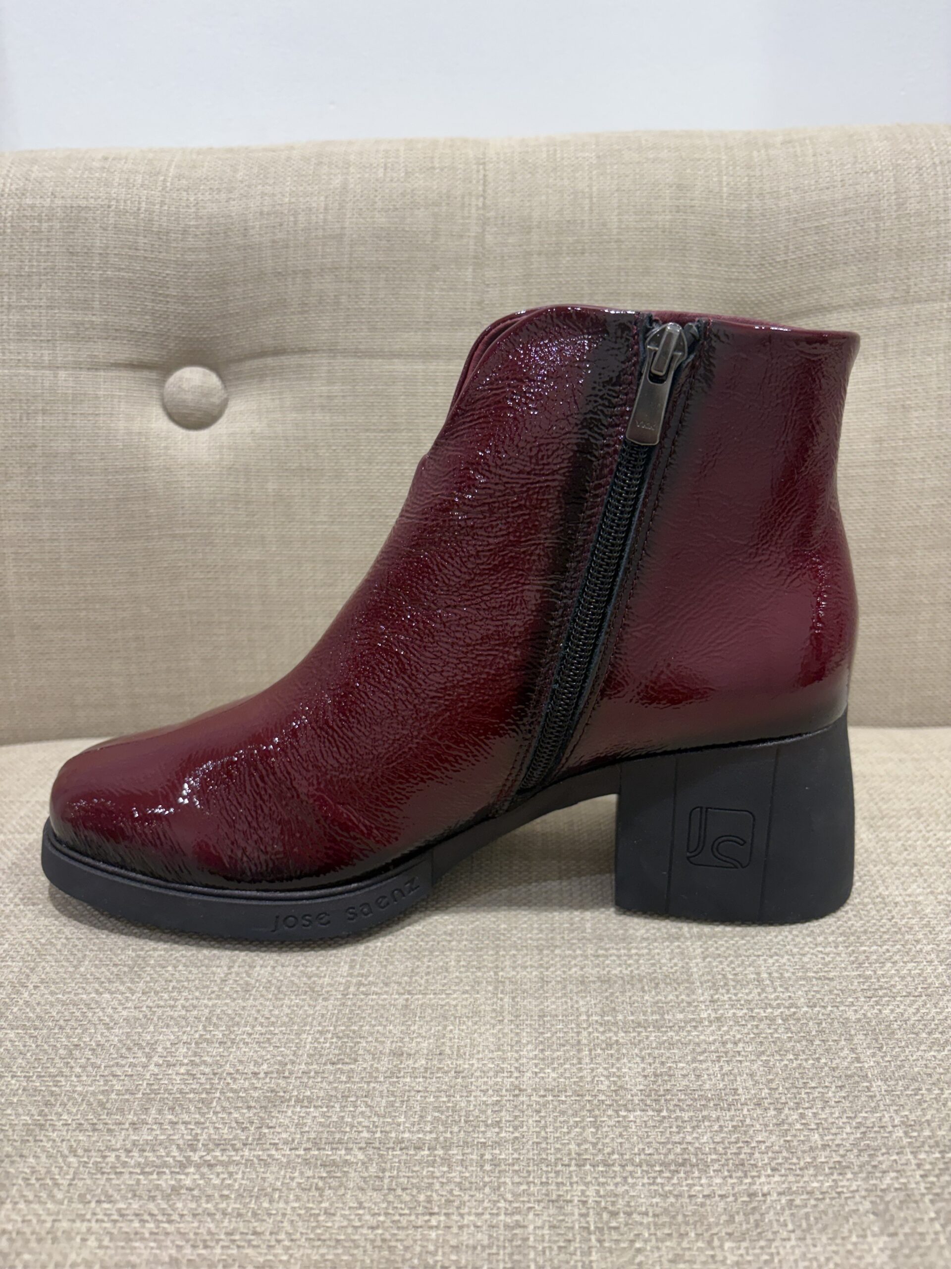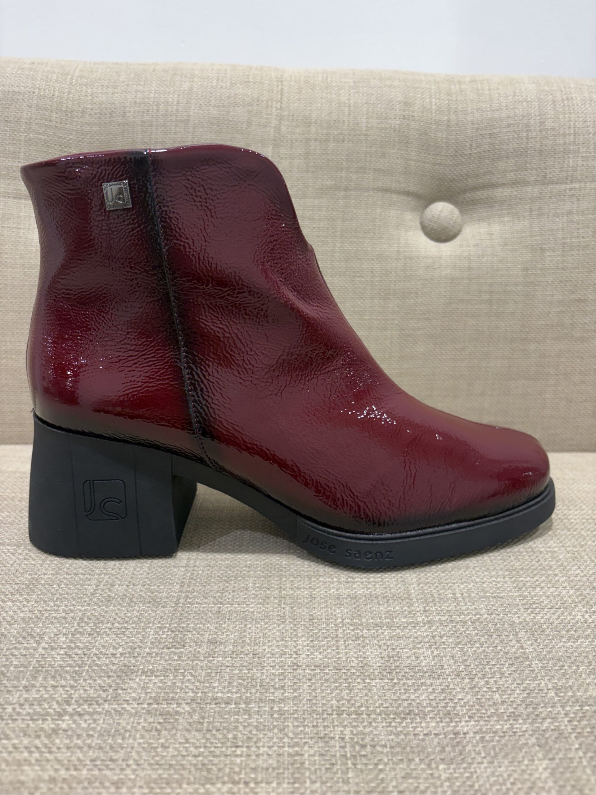 This is a burgundy patent leather ankle boot from Jose Saenz. It has a glossy, textured finish that gives it a modern and eye-catching look. The boot features a side zip for easy wear and a sturdy block heel for comfort and stability. A small metal logo detail near the top adds a refined touch. Stylish and versatile, this boot is perfect for adding a pop of colour to any outfit.
