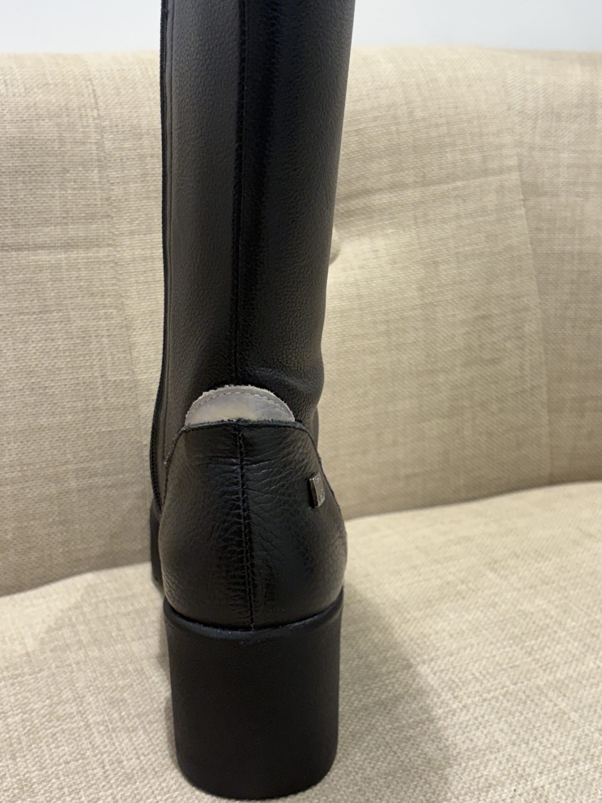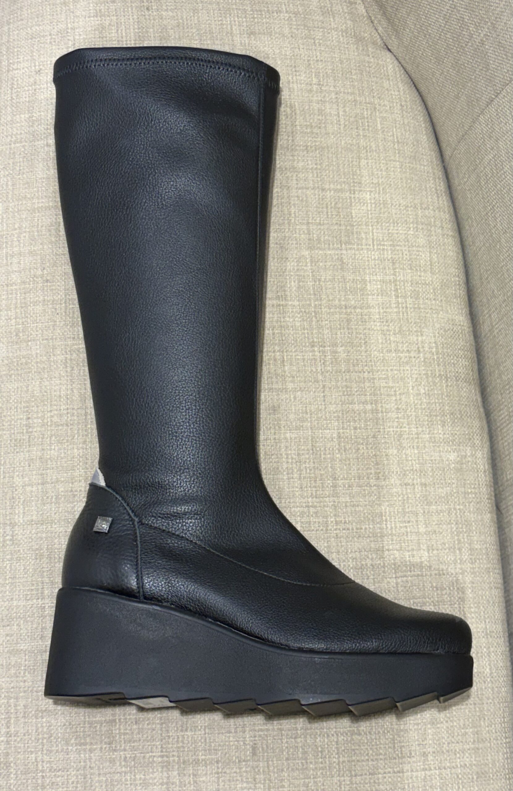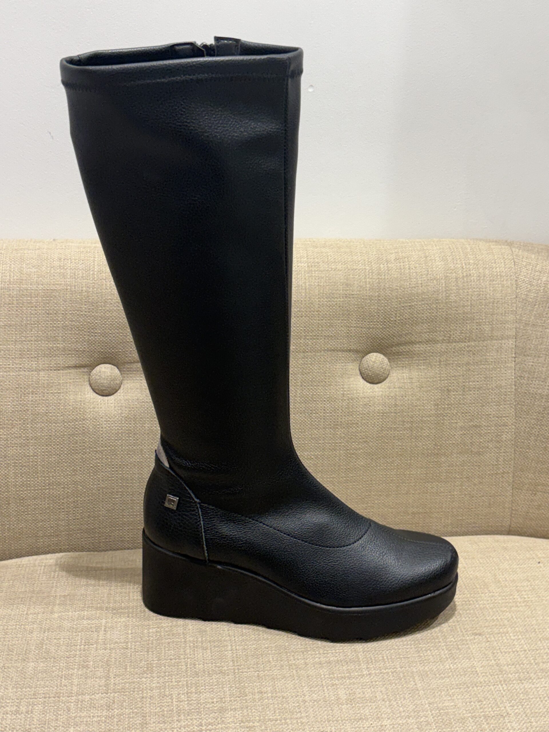 This is a black knee-high wedge boot from Jose Saenz. It is made from soft textured leather with a sleek and modern look. The boot features a comfortable wedge sole that adds height without sacrificing support and stability. A discreet side zip makes it easy to put on and take off, while a small metal logo detail adds a touch of style. This versatile boot is perfect for pairing with dresses, skirts, or jeans for a chic everyday look.