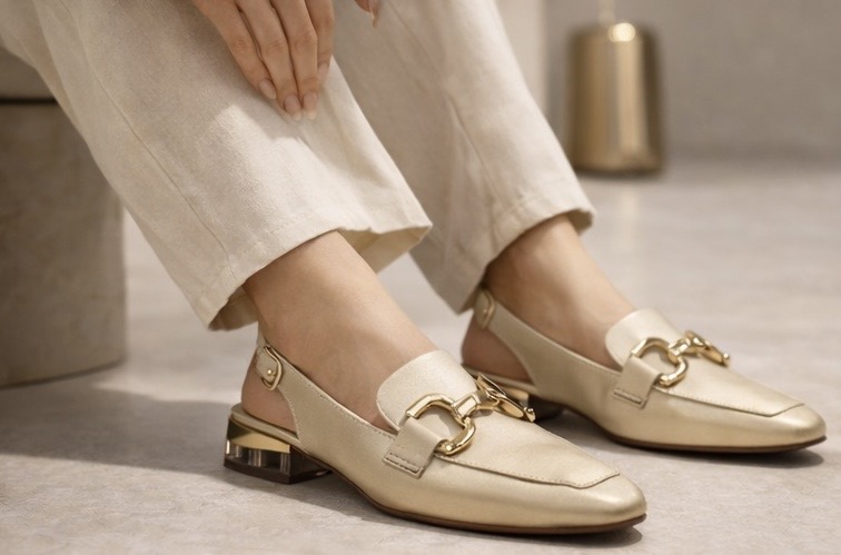 Refined and versatile, these gold slingback loafers bring effortless sophistication to everyday dressing. Designed with clean lines and timeless details, they offer a polished look that transitions seamlessly from work to weekend.