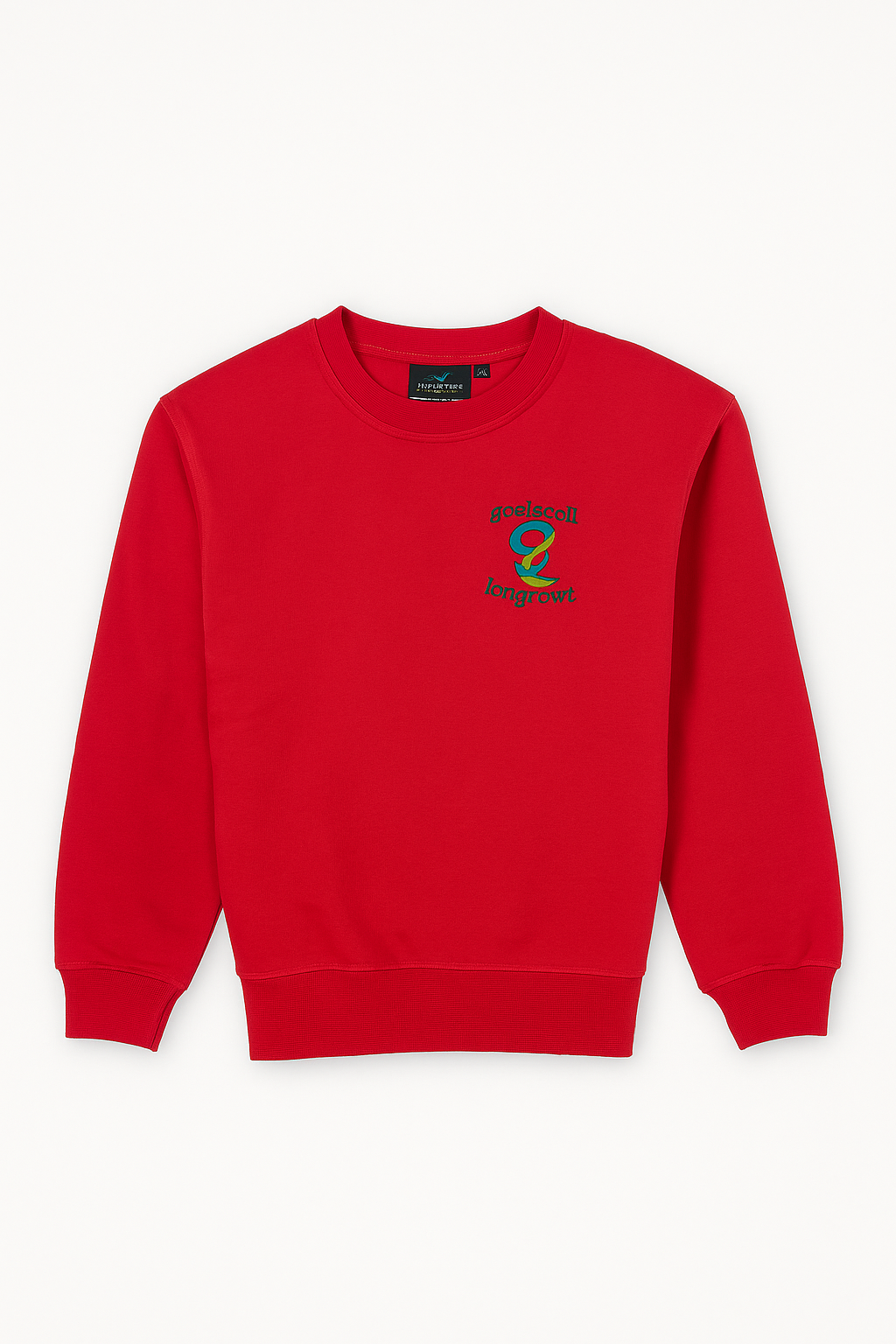 This comfy red school jumper features the embroidered “Gaelscoil Longfort” crest on the chest and is styled in a classic crew-neck cut. Made with durable fabric suitable for daily wear, it offers long sleeves, ribbed cuffs and hem for a tidy fit.