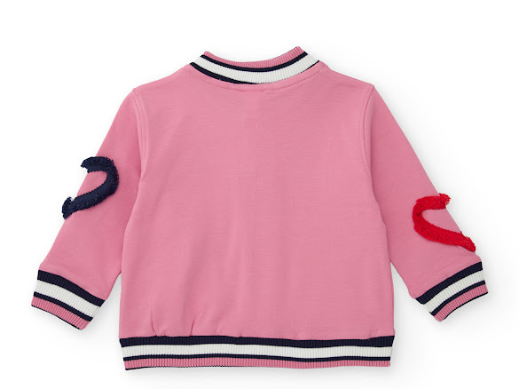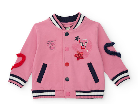 Bring sporty charm and playful style to her wardrobe with this girls’ varsity-style jacket in a delightful pink hue. Made from soft and comfortable fabric, it’s detailed with embroidered stars, hearts, and the initial “T” for a personalised touch. The standout 3D plush-textured moon appliqués on the sleeves add extra fun and texture. Designed with contrasting snap buttons and handy front pockets, this jacket blends practicality with fashion. Ribbed trims at the collar, cuffs, and hem feature navy, white, and pink stripes, completing the modern varsity look.