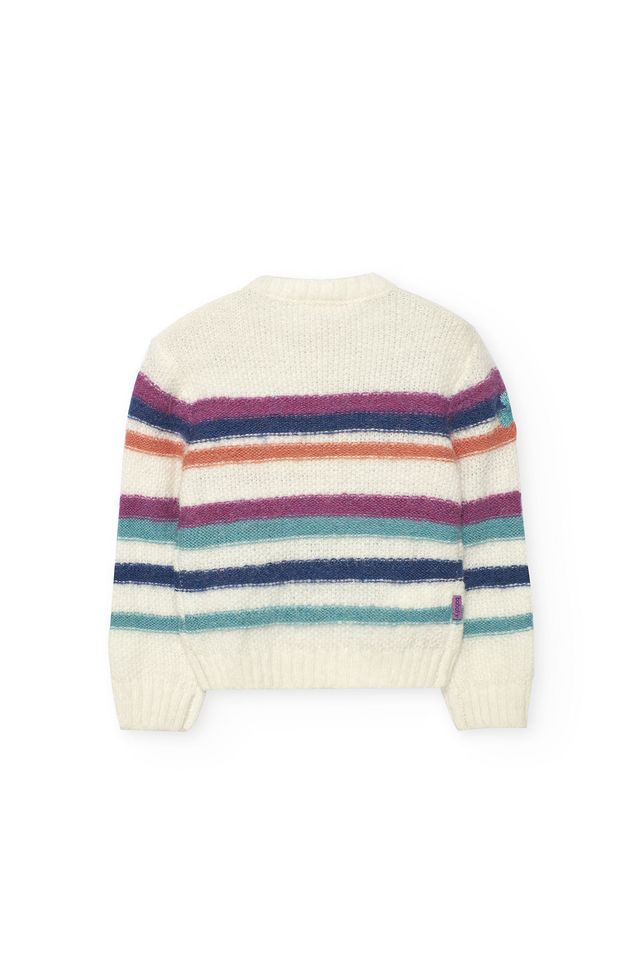 White knitted jumper with flowers, essential for girls during the autumn and winter seasons. Made from a soft fabric, it offers comfort and warmth on cooler days. Its delicate floral details add a charming and elegant touch, perfect for various occasions. It features a round neck and long sleeves, ensuring comfort. It pairs beautifully with jeans or skirts, providing a stylish and fresh look for any casual outing.