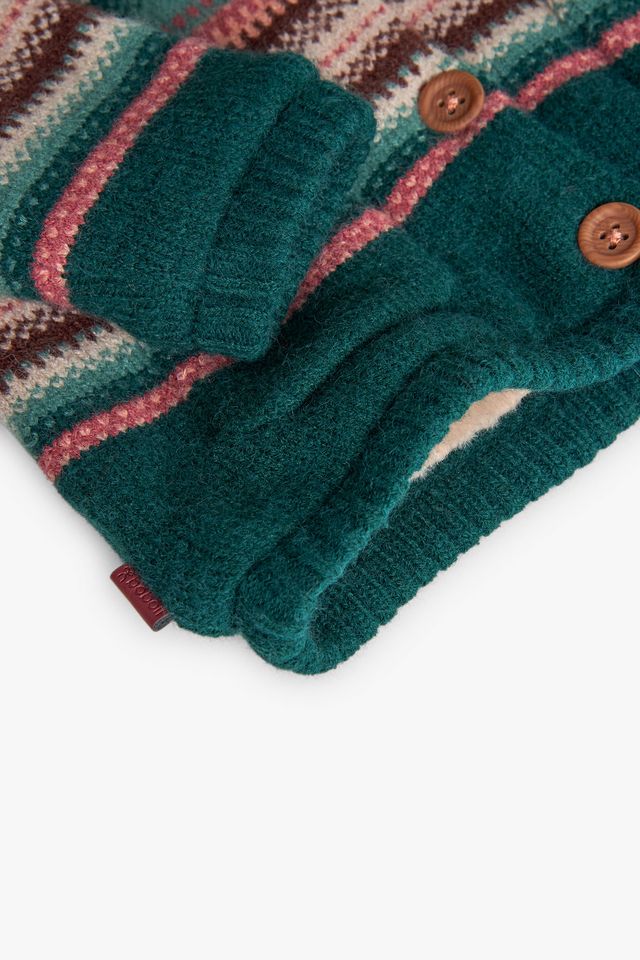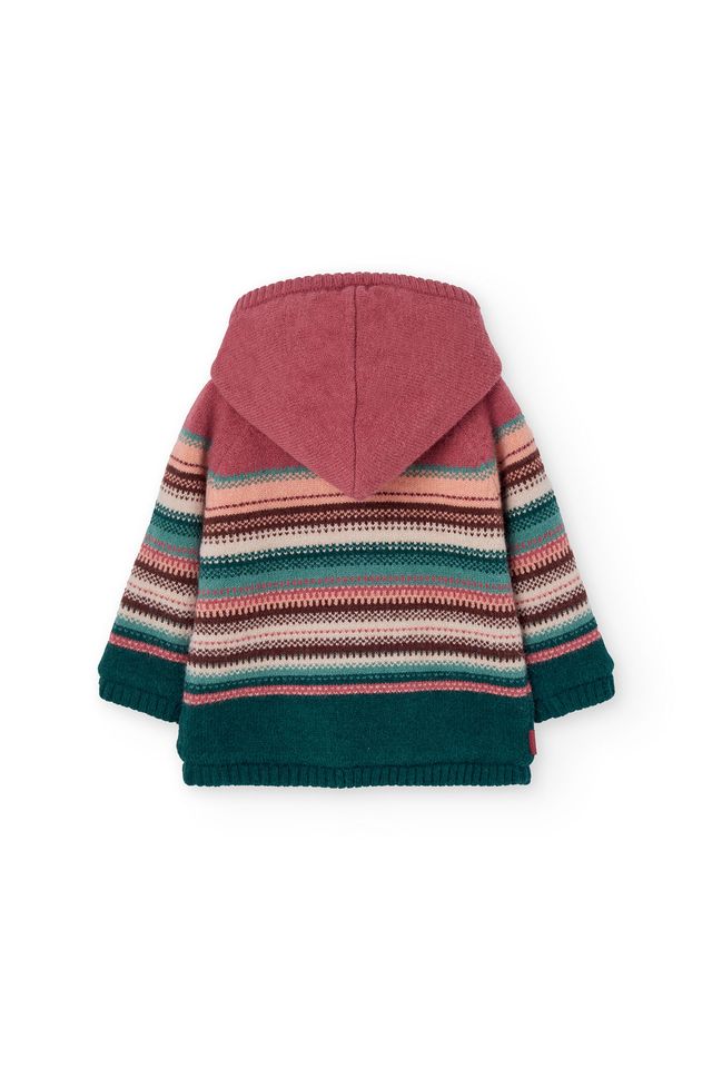 Girl’s knitted cardigan in strawberry colour with stripes, designed to offer warmth and style during the autumn and winter seasons. Made from a soft and comfortable fabric, it ensures your little one stays cosy on cold days. A practical front button closure allows for easy dressing and undressing, perfect for everyday wear. It can be paired perfectly with trousers, dresses, or skirts for an adorable and versatile look.