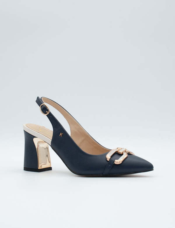 Elegant and contemporary, these navy slingback heels combine a sleek silhouette with modern detailing. The design features a refined pointed toe and statement gold hardware across the front for a polished, sophisticated finish.