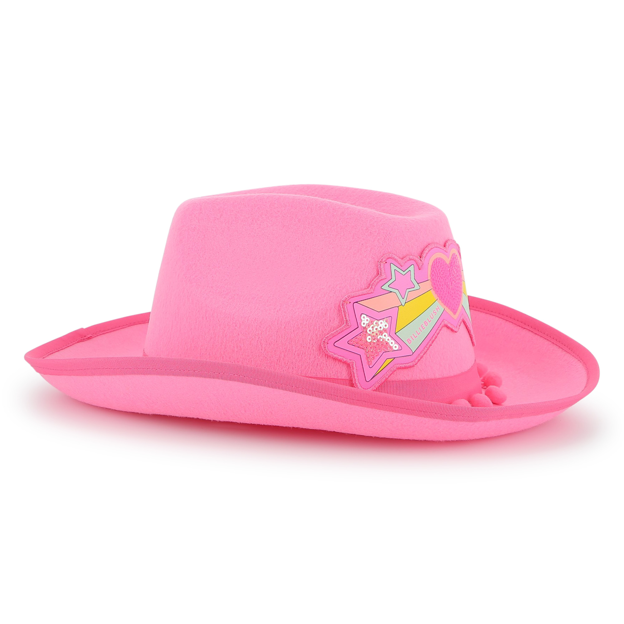Make a bold style statement with this eye-catching pink Western-style hat for girls by Billieblush. Crafted in soft felt, it features a playful heart and shooting stars illustration in vibrant colours, finished with sparkling sequins for extra shine. Trimmed with pom-poms and a grosgrain band, this fun accessory adds a pop of colour and personality to any outfit – perfect for parties, dress-up, or brightening everyday looks.