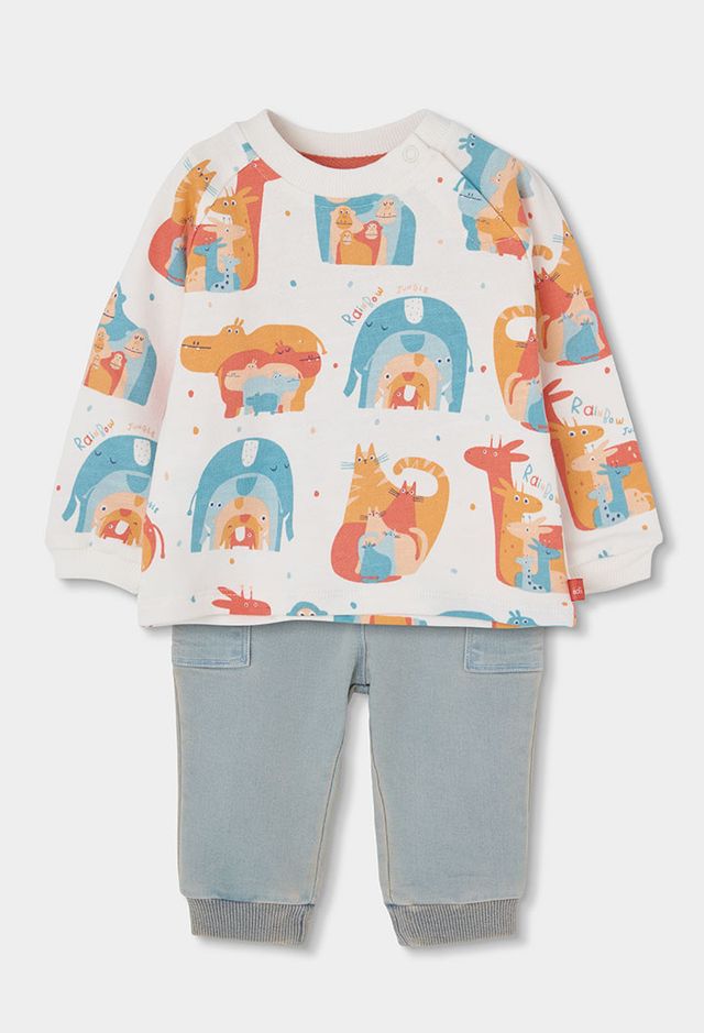 A cosy and practical outfit set for baby boys, designed for comfort on cooler days. The long-sleeved top features a colourful animal print for a fun, playful look, while the soft fabric keeps it gentle on delicate skin. Paired with denim-style trousers with an elasticated waistband, this set offers both comfort and easy movement—ideal for everyday wear.