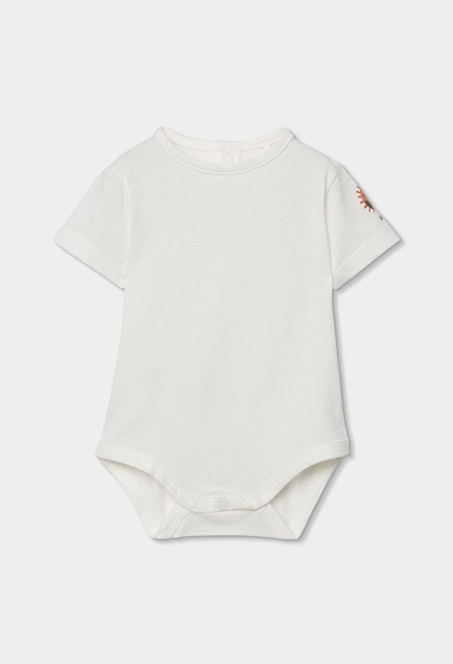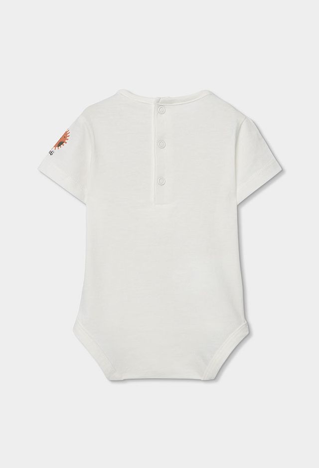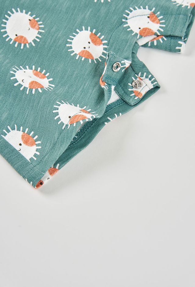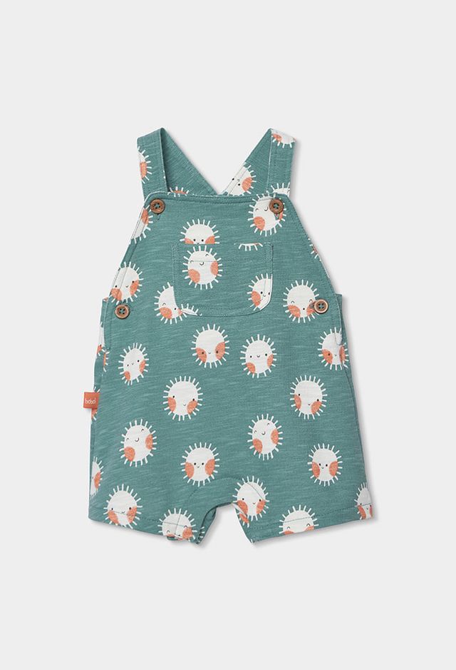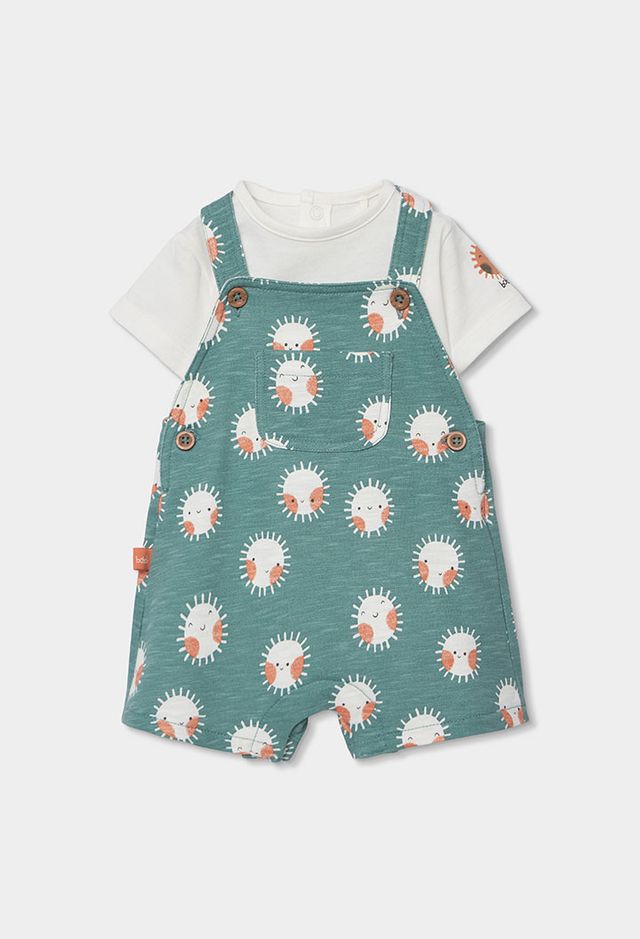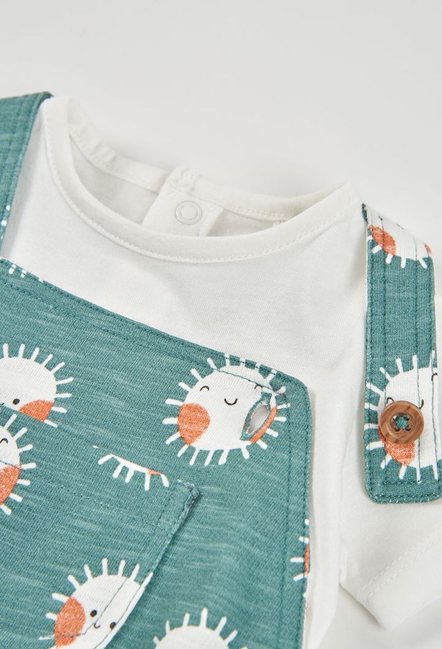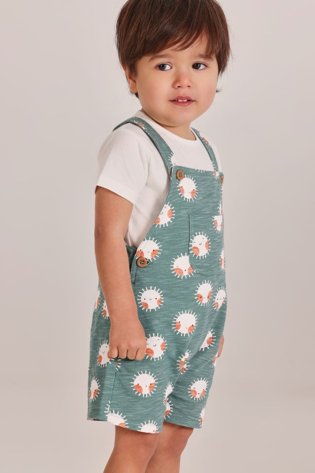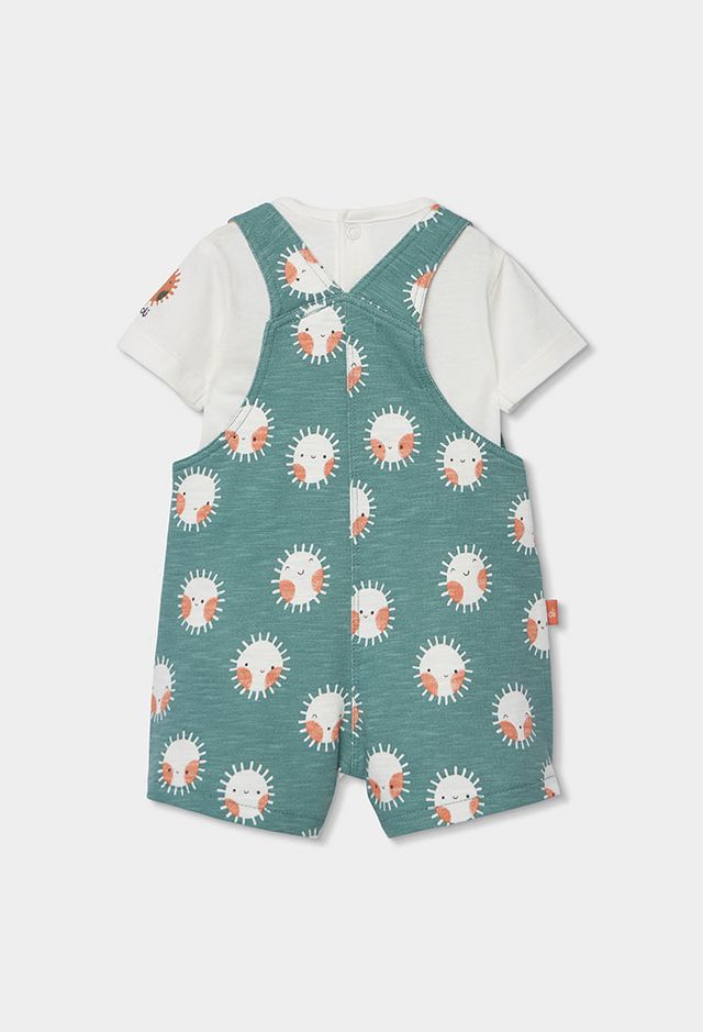 A comfortable and playful outfit set for boys, featuring a soft white short-sleeved bodysuit paired with green dungarees. The dungarees are finished with a fun sun print for a bright, cheerful look. Designed for easy everyday wear, the adjustable strap buttons make dressing and changing quick and simple.