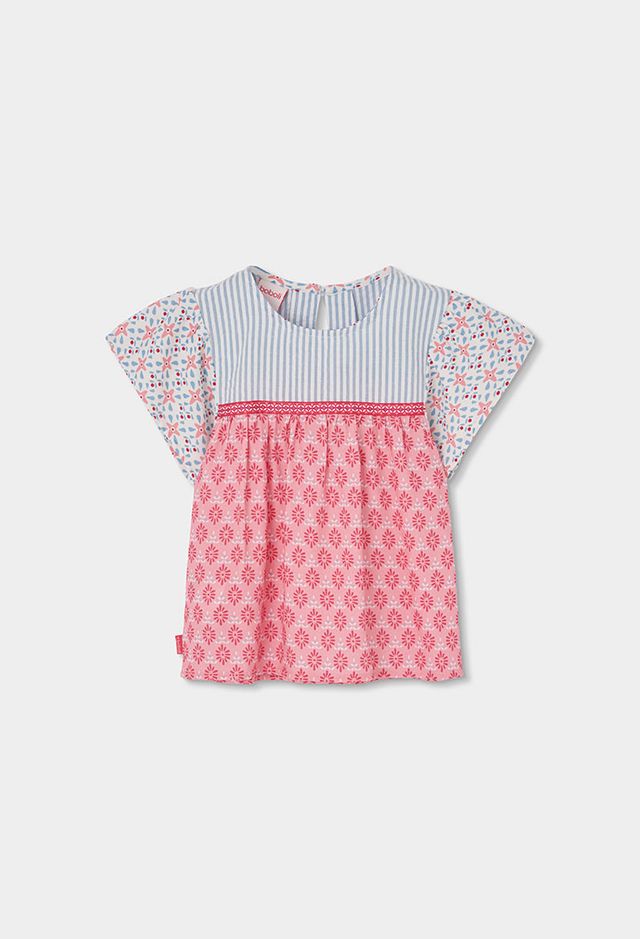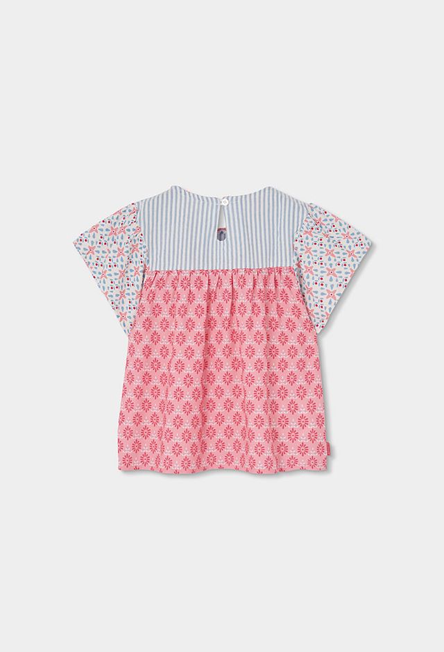 A lightweight poplin blouse for girls, designed for comfort and easy summer styling. Featuring a mix of soft prints in white, blue, and pink tones, it adds a fresh and playful look. The loose fit allows for easy movement, while the breathable fabric keeps it cool on warmer days—perfect for pairing with shorts or skirts.