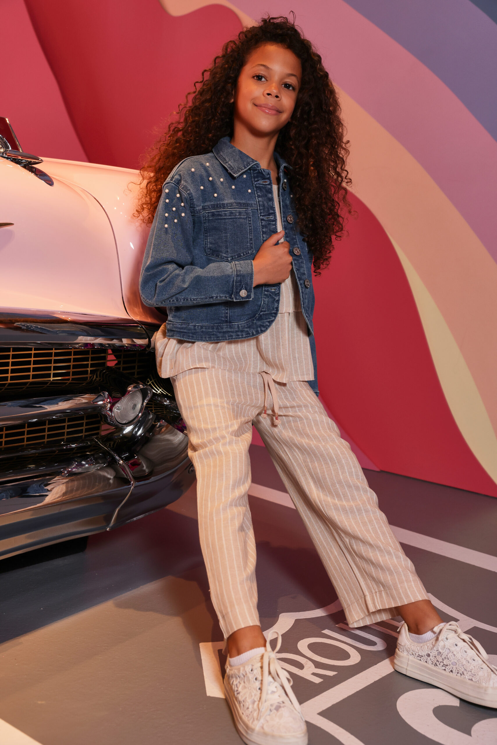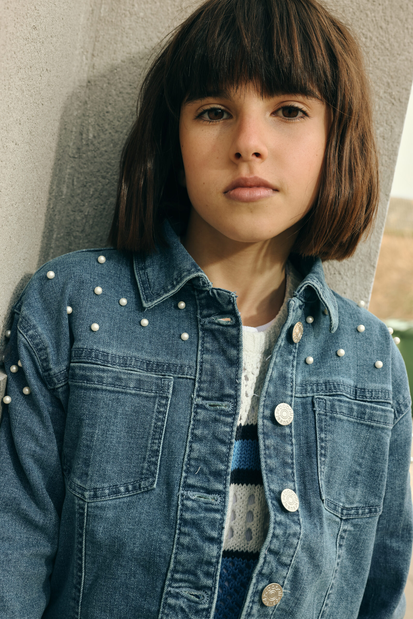 Denim jacket for girls, ideal for a casual and modern look. Made from light blue denim fabric, it stands out with its design featuring small decorative embossed details that add a chic touch. It includes a front button closure and flap pockets on the chest. Designed for comfort. You can easily pair it with dresses or trousers for a versatile and relaxed style. The long sleeves and classic cut make it a timeless and practical garment for various occasions.