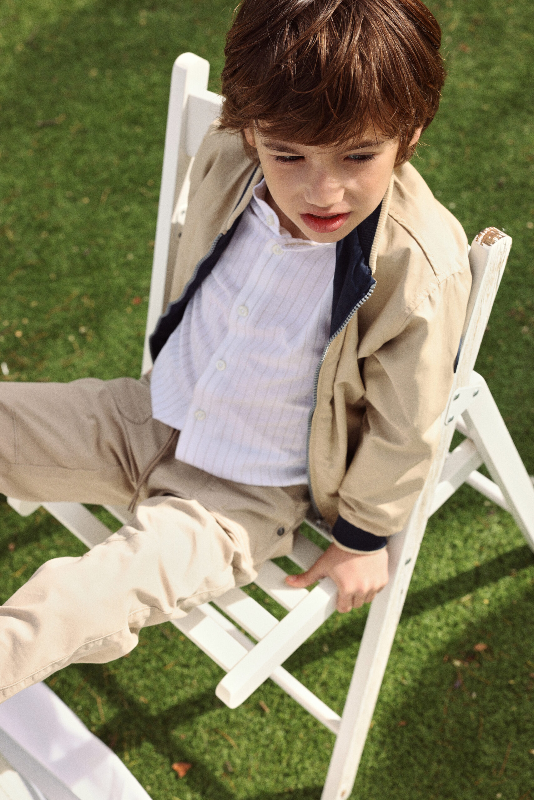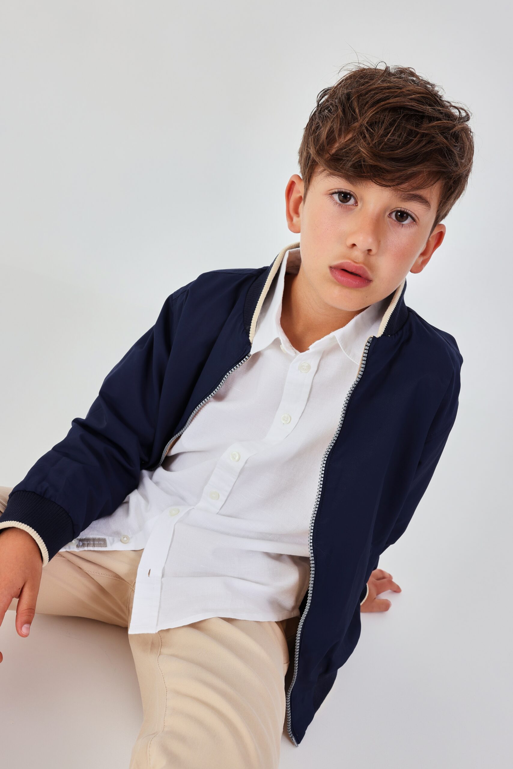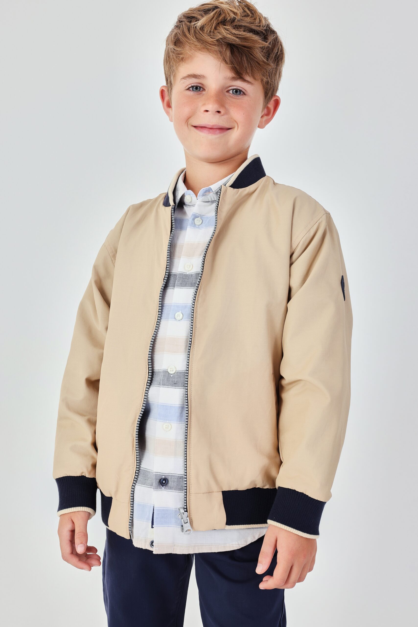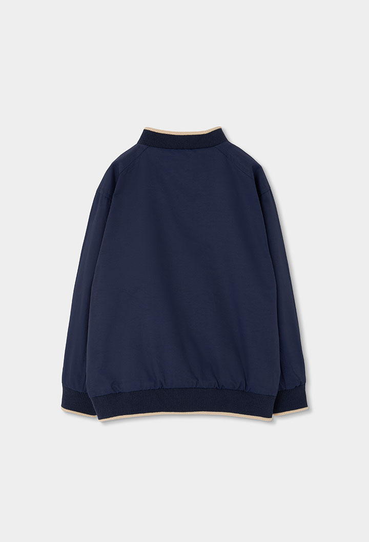 Reversible technical fabric jacket for boys, ideal for transitional weather. In beige and navy blue, it features a classic design with a zipper fastening. The long sleeves and round neck with ribbed cuffs provide warmth and comfort. Its versatile style makes it perfect for pairing with jeans or casual trousers, offering a modern and cosy appearance for warm days.