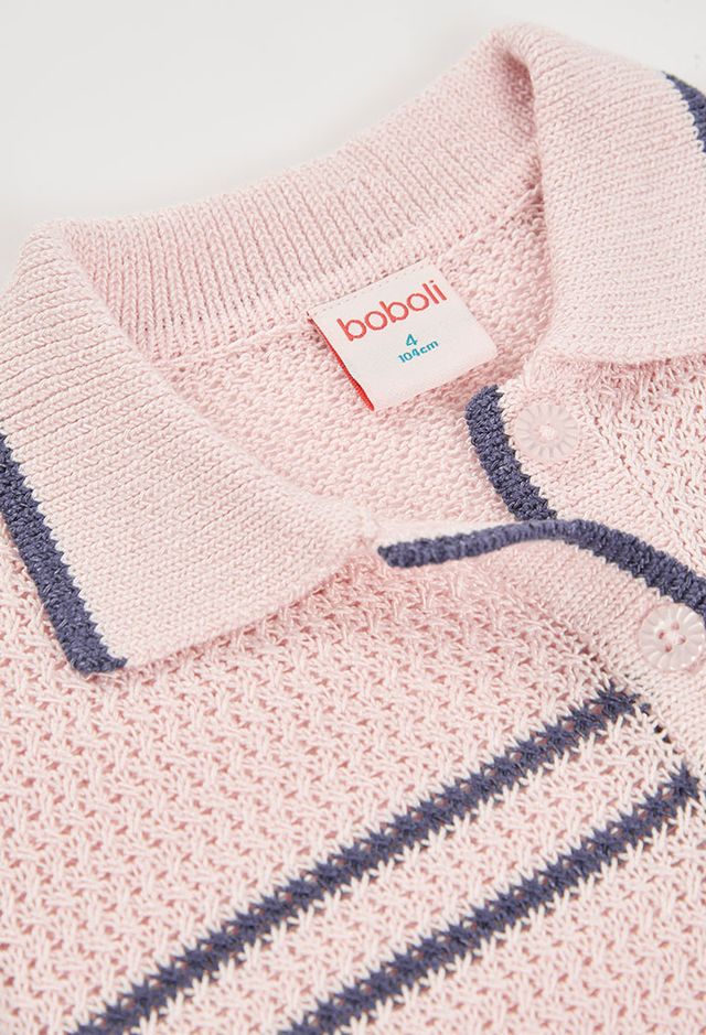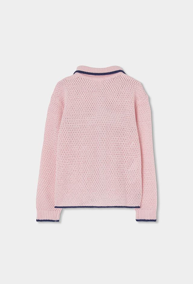 Pink knitted jacket for girls, ideal for the spring season. Made from soft fabric, it offers warmth and comfort. Featuring a design with buttons at the front and navy blue details on the collar and cuffs that add an elegant touch. It is perfect for casual occasions and can be easily paired with trousers or skirts. It is a versatile and functional garment that suits the everyday style of any girl.