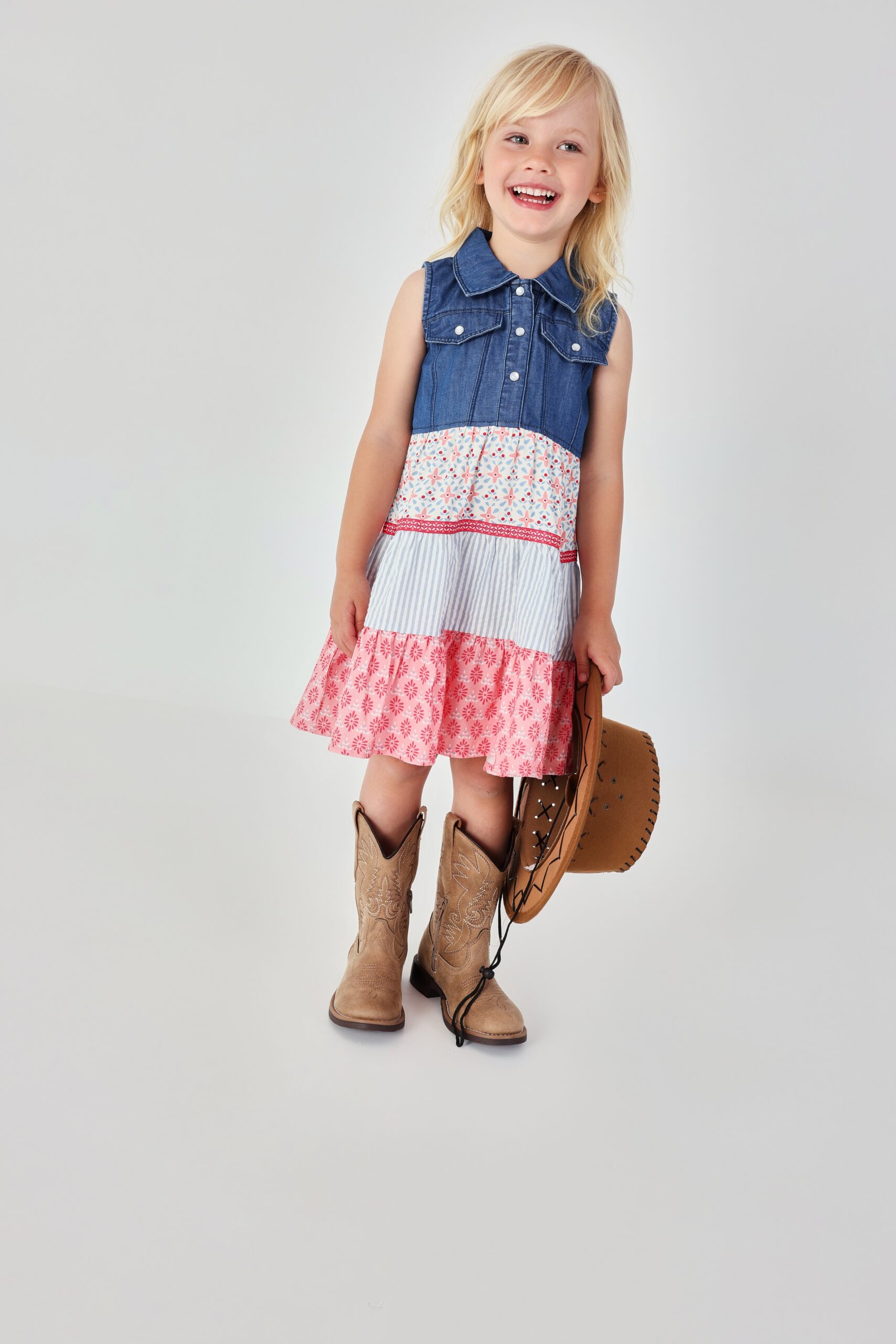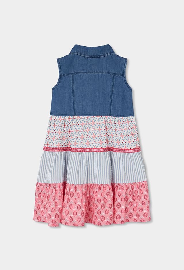 Combined denim dress, perfect for a cheerful summer look. The top is made of denim fabric with a classic collar and buttons, while the skirt has layers of different prints and colours: flowers and stripes in pink and blue tones. Its sleeveless design allows for freedom of movement. It is a versatile garment that combines style and comfort, suitable for sunny days and special occasions.