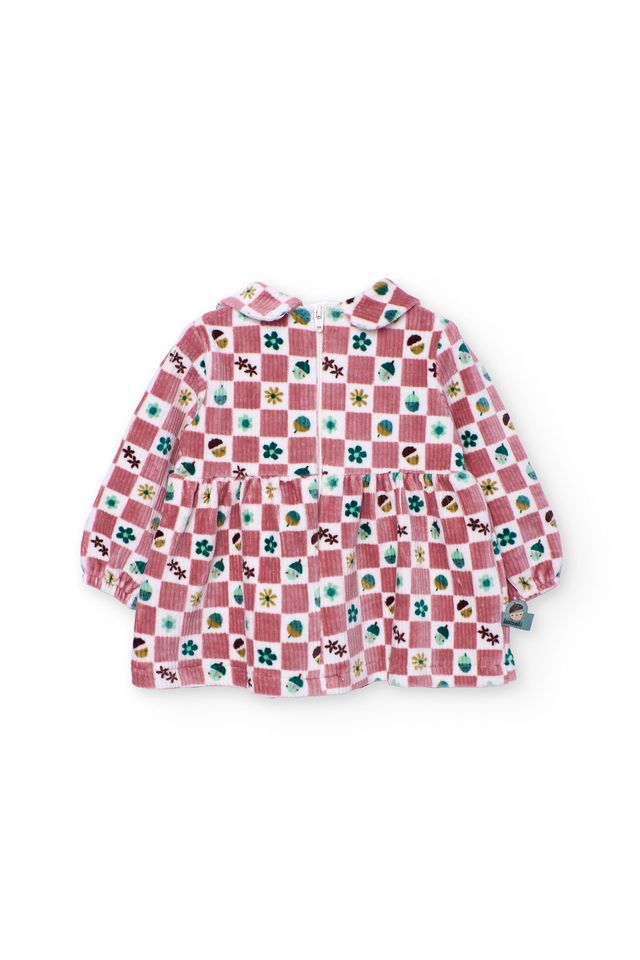 Baby knitted dress with pink checkered design, perfect for the autumn and winter seasons, keeping your little one warm and comfortable. Made from a soft material. Round neckline with ruffles and long sleeves, featuring a classic and elegant style, ideal for special occasions or everyday wear. Easily pairs with tights and coats to complete the look.