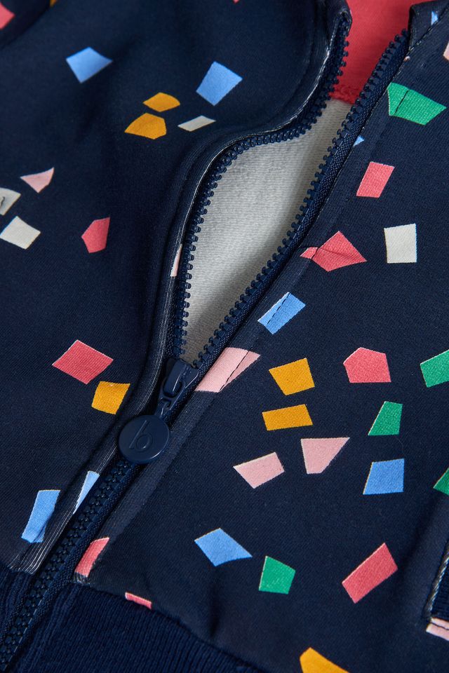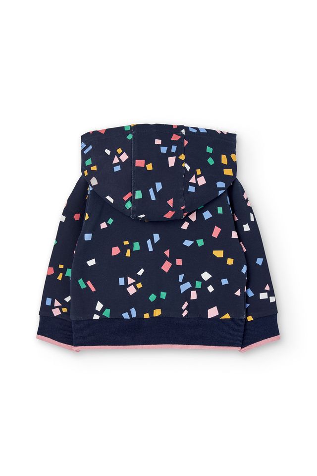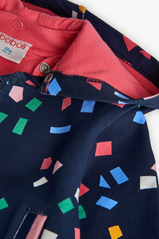 Navy plush jacket for girls with a geometric design, perfect for keeping your little one comfortable and warm during the autumn and winter seasons. Made from a soft and warm fabric, it ensures the baby’s well-being while wearing it. It offers versatility and style, perfectly pairing with trousers or skirts. Ideal for creating a charming and functional look for any occasion.