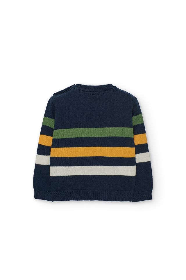 Navy blue knitted jumper for boys with plane pattern, suitable for autumn and winter seasons. Made from knitted fabric, it provides warmth and comfort, ensuring your little one stays cosy. Designed with a round neck and buttons on the shoulder, it makes daily dressing easy. It is versatile and easily pairs with casual trousers. The elegant navy blue colour offers a classic style that complements any children’s wardrobe.