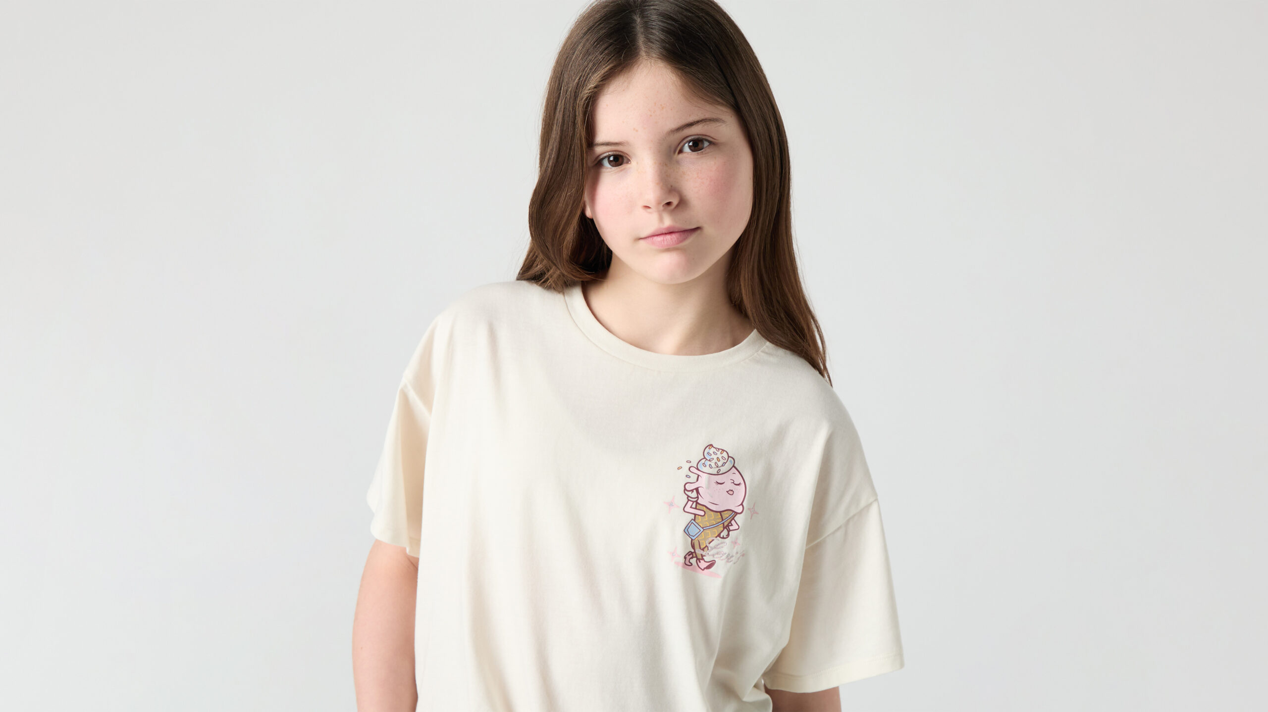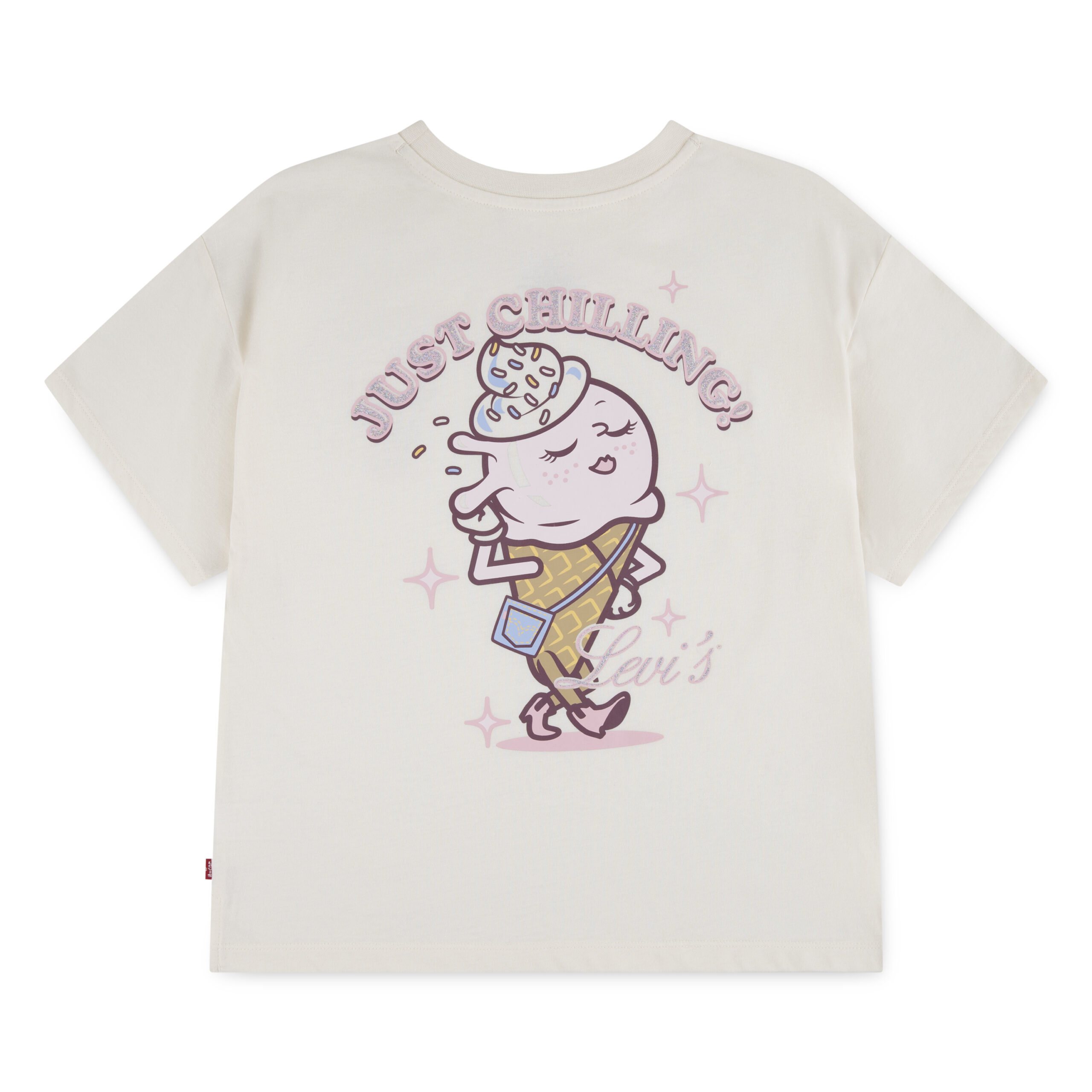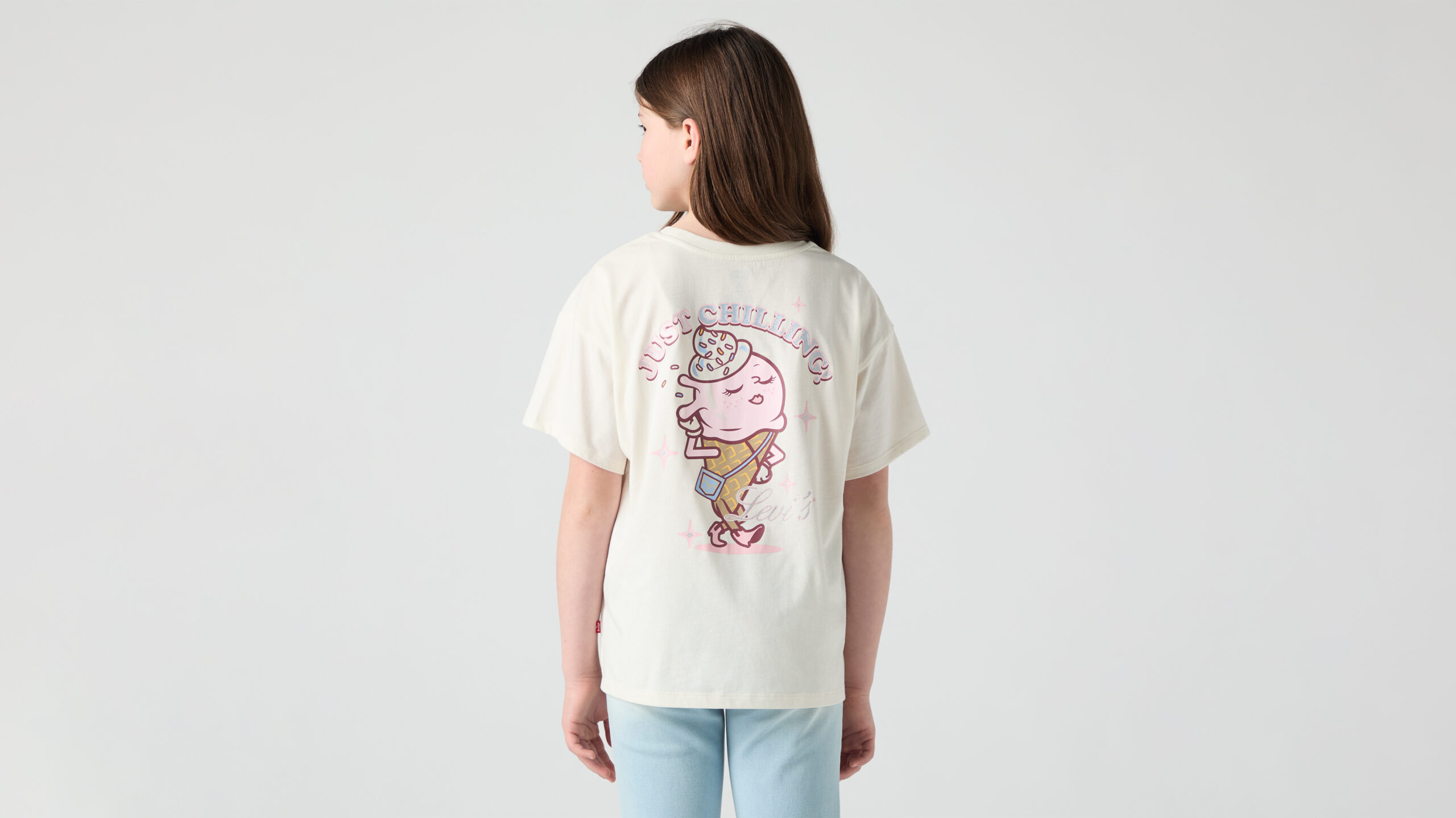 Add a playful touch to her everyday wardrobe with this Levi’s girls graphic T-shirt. Crafted from soft cotton for all-day comfort, this relaxed-fit tee features a fun “Just Chilling” graphic with a cute ice cream character and subtle Levi’s branding. The oversized silhouette and classic crew neckline create a laid-back, trendy look that’s perfect for casual styling. Easy to pair with jeans, shorts, or leggings, this Levi’s T-shirt brings a fun and stylish vibe to any outfit.