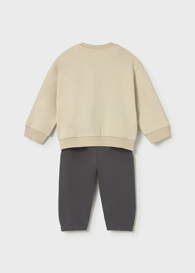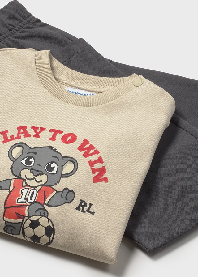 This comfortable baby boy 2-piece tracksuit by Mayoral is perfect for little ones aged 6 months to 3 years. It includes dark grey joggers and a beige top featuring a playful football theme design that adds fun to everyday wear. Made from soft, baby-friendly fabrics, the set is gentle on delicate skin and ideal for playtime, outings, or relaxed days at home.