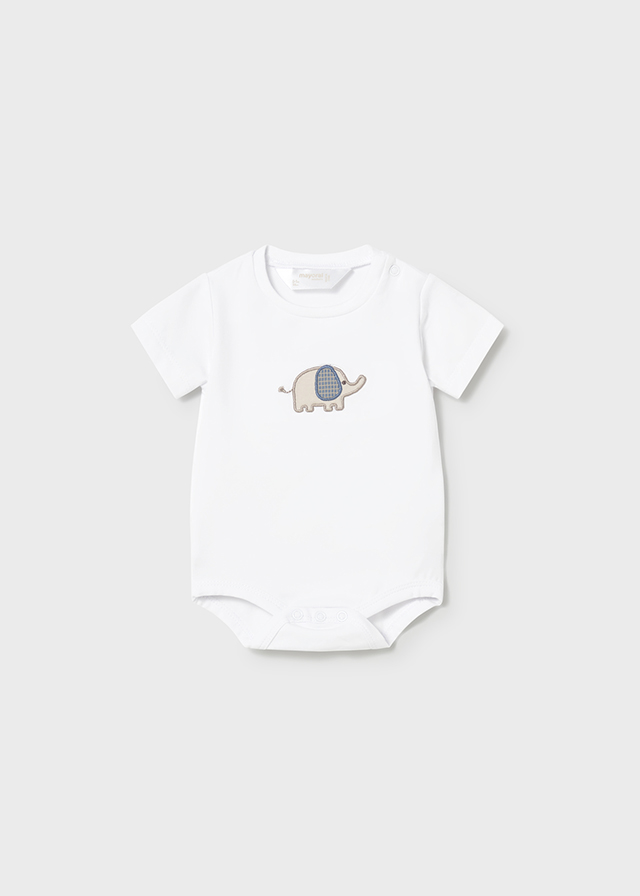 This adorable baby boy 3-piece tracksuit by Mayoral includes a pair of blue joggers, a blue and beige hoodie featuring a charming elephant design, and a coordinating white T-shirt with a subtle hatching pattern. Made from soft, baby-friendly fabrics, the set is designed for everyday comfort and easy movement. Ideal for playtime, outings, or relaxed days at home.
