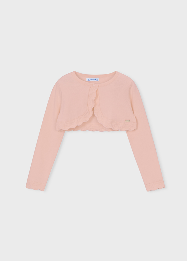 Designed with a charming scalloped edge along the neckline and front, it brings a subtle decorative detail that complements dresses, skirts, or casual outfits beautifully. The cropped silhouette makes it ideal for layering over occasion dresses without covering the full design.