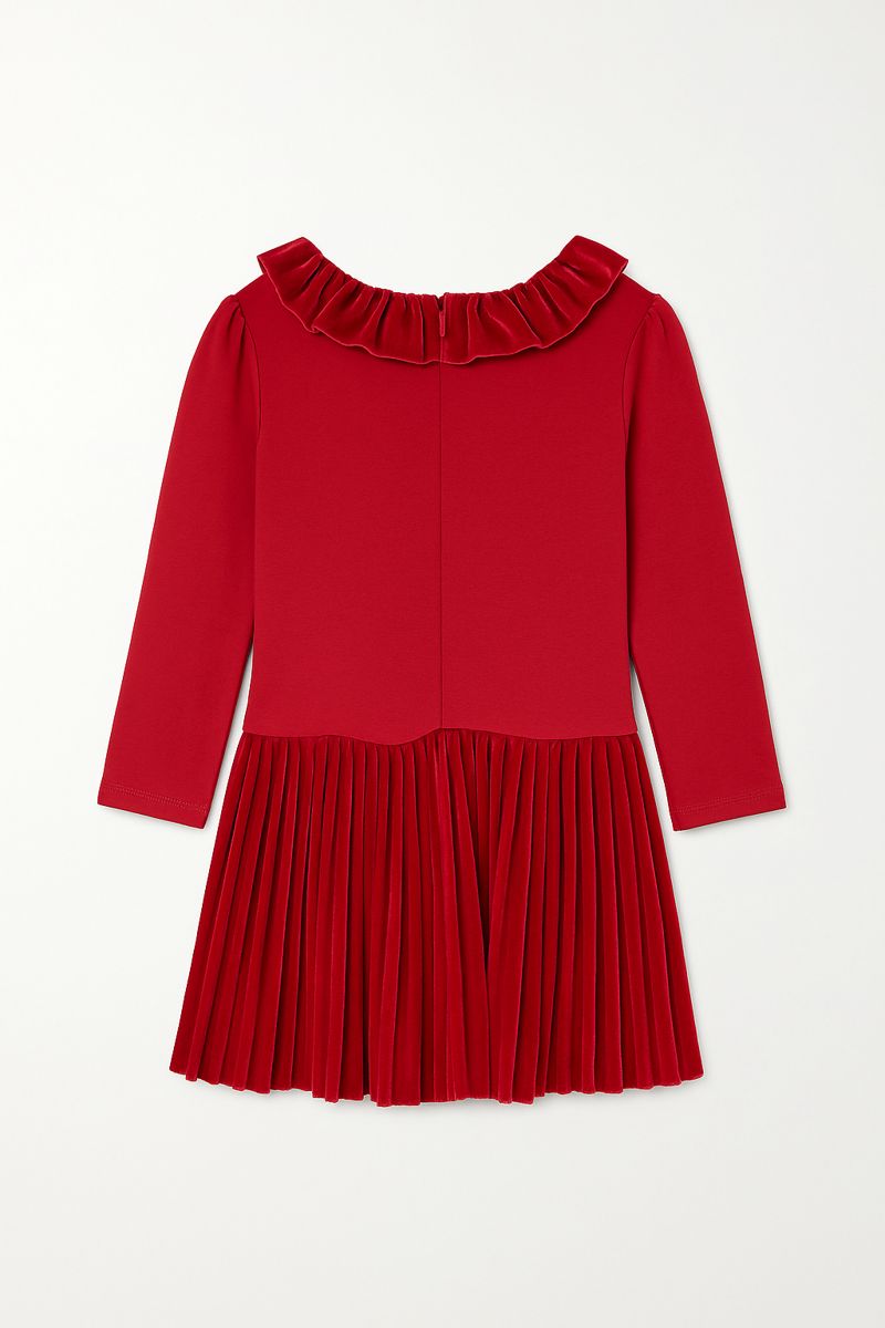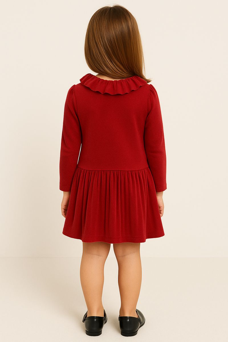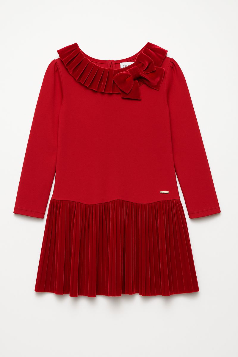 This red girls’ dress from Patachou is soft, comfortable, and perfect for special occasions. It has a pretty velvet ruffled collar with a matching bow and a pleated velvet skirt that gives it a classic look. The dress fastens at the back with a hidden zipper and is easy for little ones to wear all day.