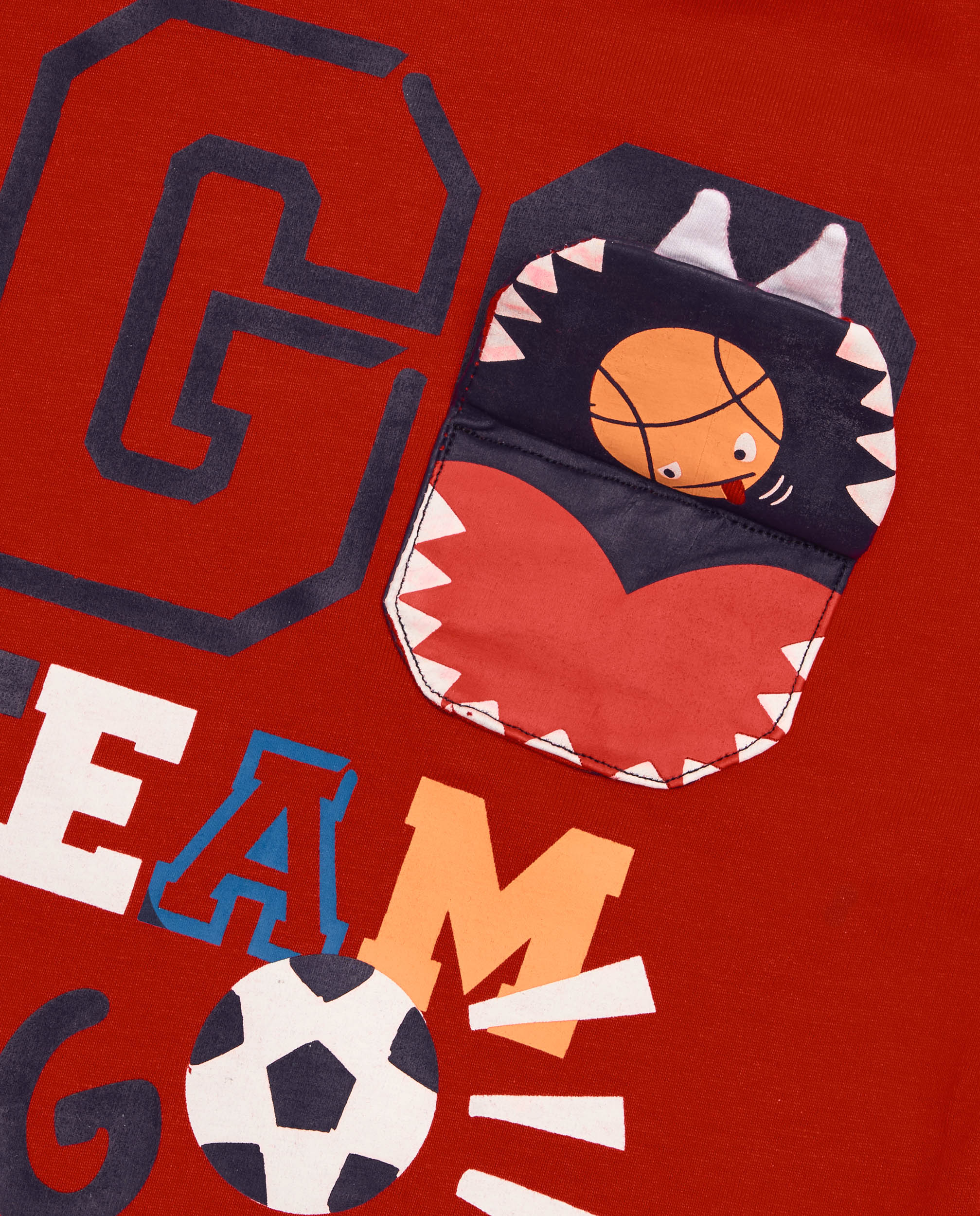 Add a sporty twist to his everyday wardrobe with this boys’ red long-sleeve t-shirt, crafted from soft, breathable cotton for all-day comfort. The bold sports-inspired print features multicoloured “GO TEAM” lettering with playful textures, a football graphic, and a fun illustrated tiger for a winning look.
