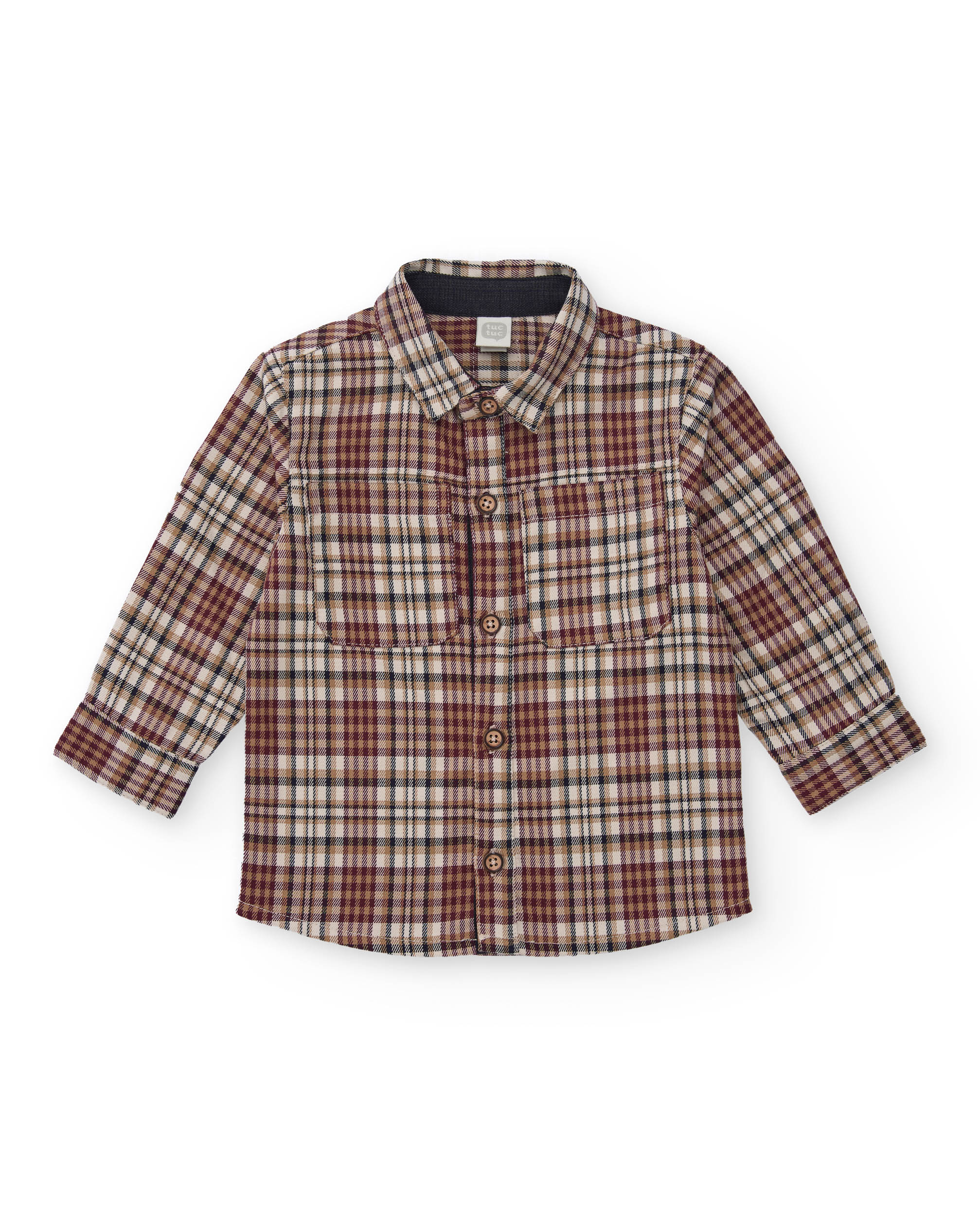 Soft flannel shirt for boys with long sleeves and a checkered pattern in burgundy, beige and blue tones. Features button fastening, a front flap pocket and contrasting elbow patches.