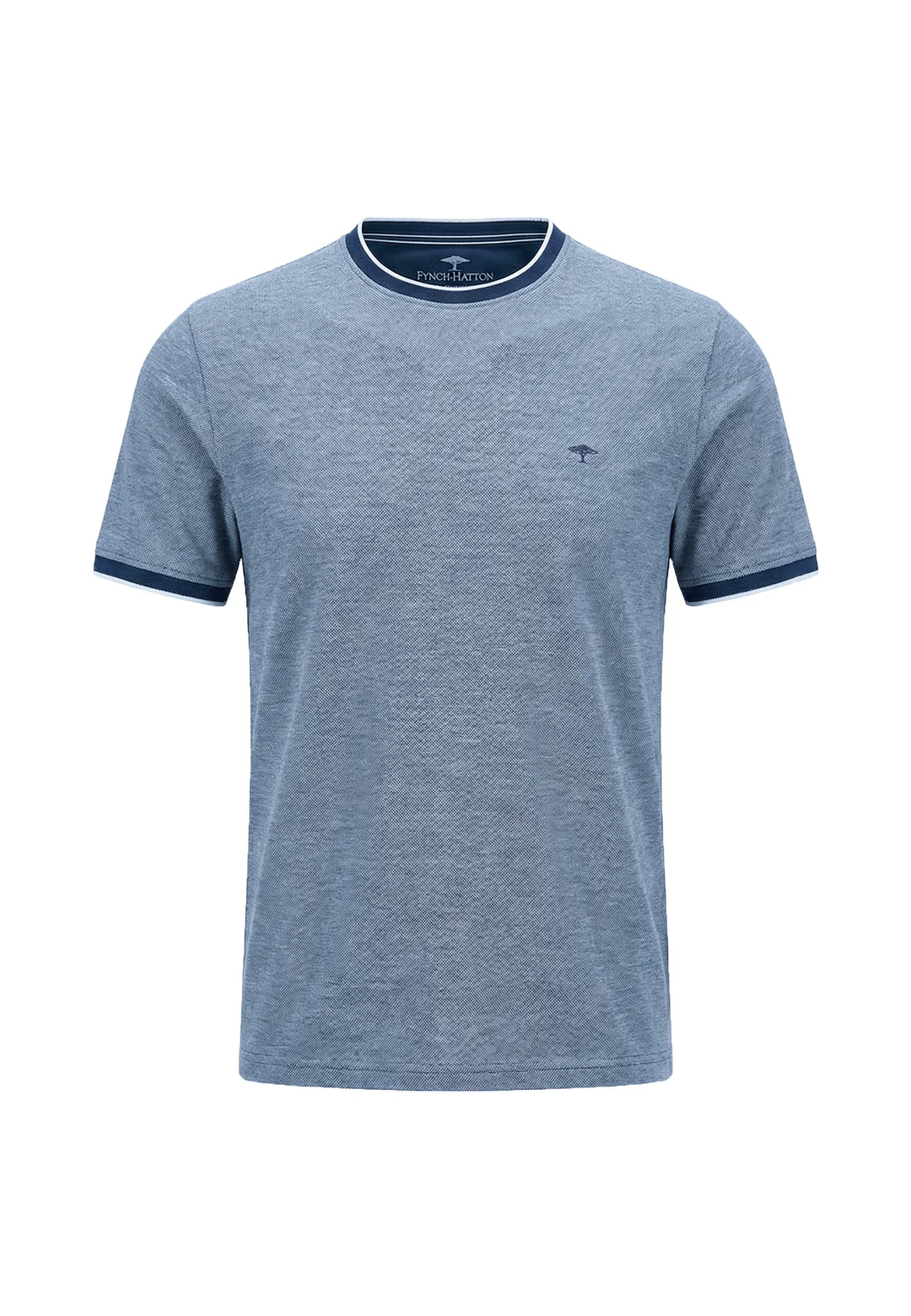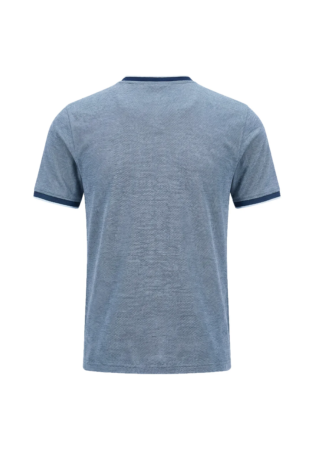 This blue t-shirt features a subtle textured finish, elevated by contrast trim at the neckline and sleeves for a clean, sporty look.