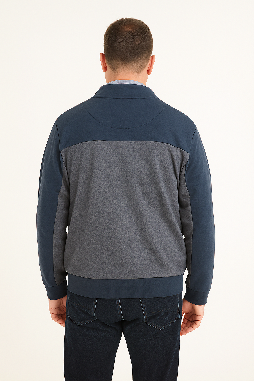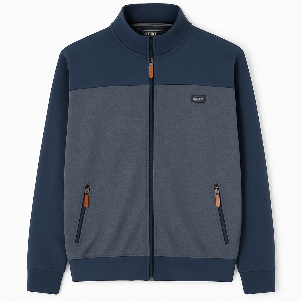 This stylish jacket from hajo features a two-tone design with a rich navy upper and a subtle grey lower section. It has a full front zip closure, a stand-up collar for added structure, and comfortable ribbed cuffs and hem. Clean, modern and easy to layer — perfect for casual days or relaxed smart-casual layering.