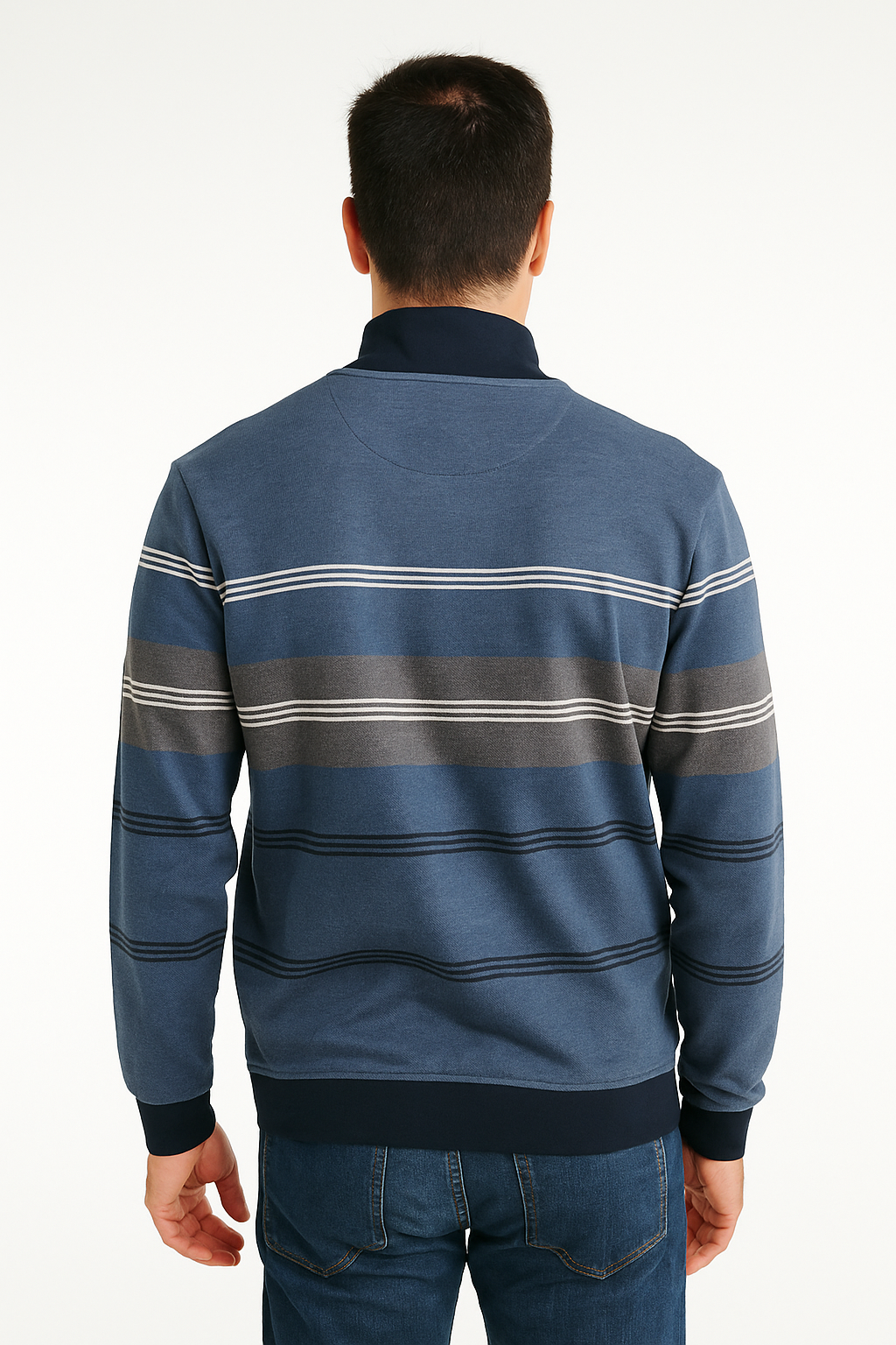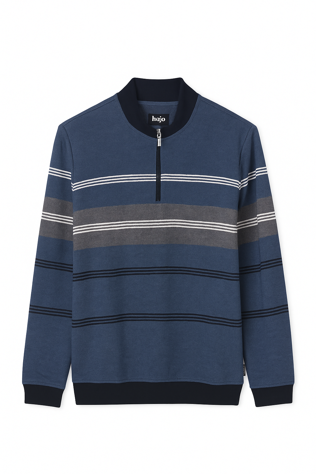 This Hajo men’s half-zip sweater offers a perfect balance of comfort, style, and practicality. Designed in a mix of blue and grey tones with subtle horizontal stripes, it’s ideal for a smart-casual look. The high collar with a zip detail adds a modern touch, while the soft cotton-blend fabric ensures warmth and all-day comfort. Finished with ribbed cuffs and hem for a neat fit, this sweater pairs effortlessly with jeans or chinos for any occasion.