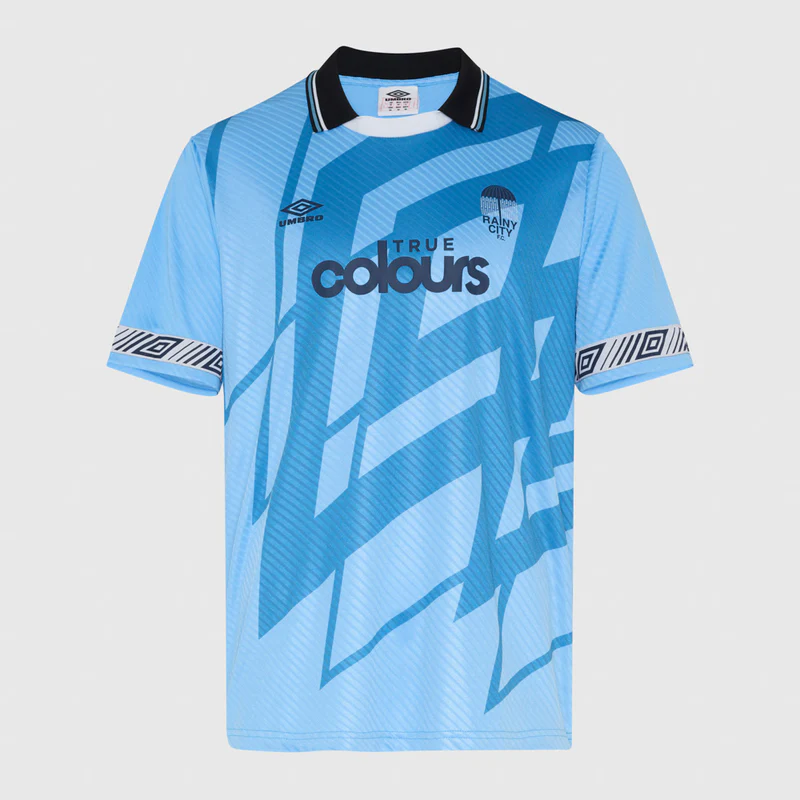 Featuring Umbro’s iconic double diamond sleeve taping, a tipped collar and a relaxed 90s-style fit, this shirt celebrates classic football culture. The “Rainy City” crest playfully nods to Umbro’s Manchester roots and a legendary sky-blue football legacy. Perfect for fans of vintage aesthetics, football heritage and street-ready fashion.