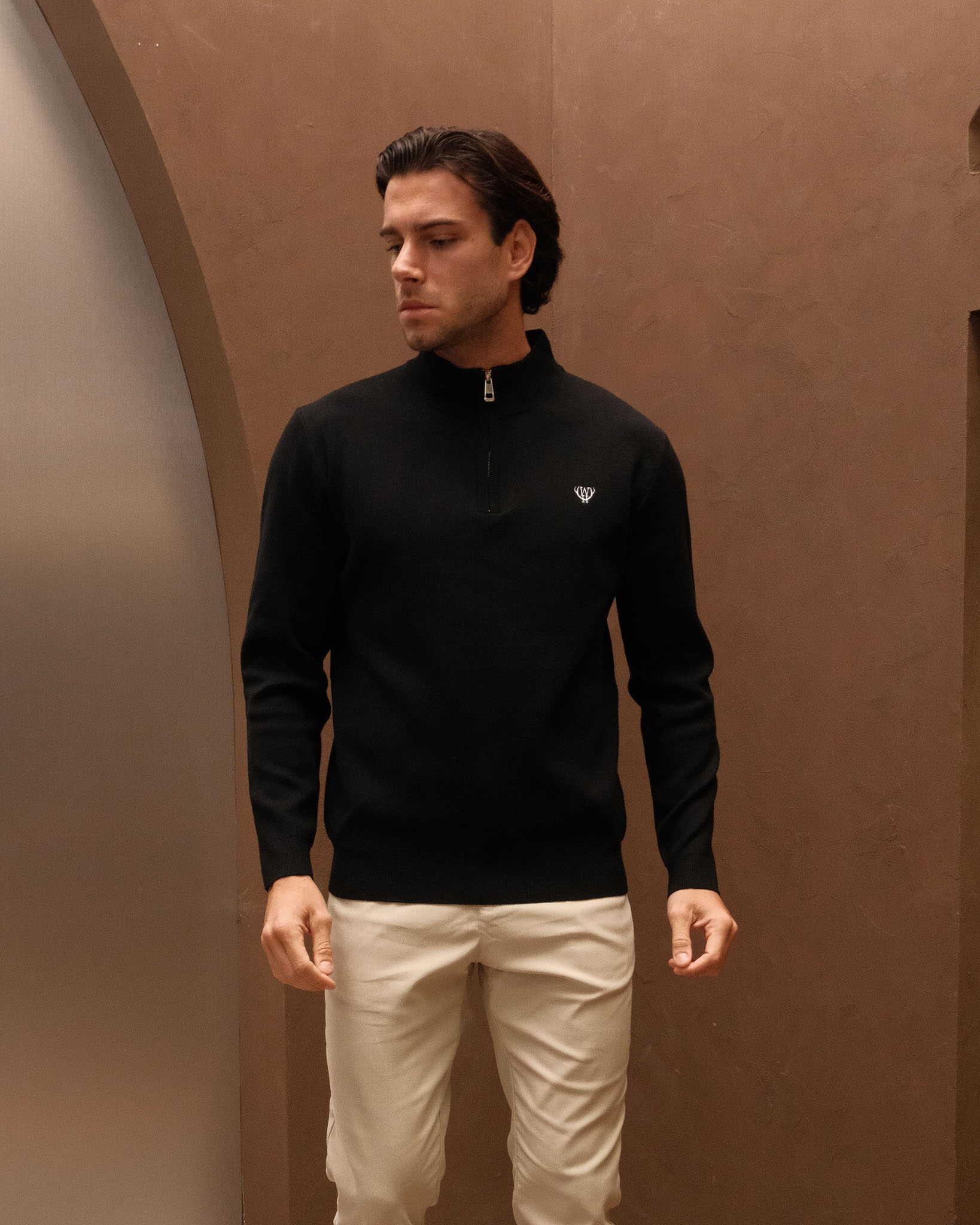 Stay warm in effortless style with the Walk & Hunt Classic Black 1/2 Zip Knitted Jumper. Designed with practicality and comfort in mind, this jumper features a half-zip collar that allows easy ventilation and versatile styling — wear it zipped up for warmth or open for a relaxed look.