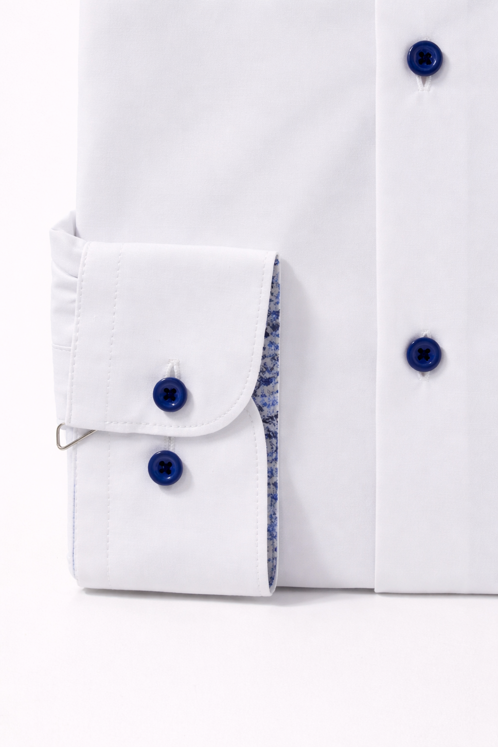 Zazzi classic, modern fit white men’s dress shirt with blue contrast buttons and patterned inner collar. Perfect for formal wear, office styling, and smart occasions.