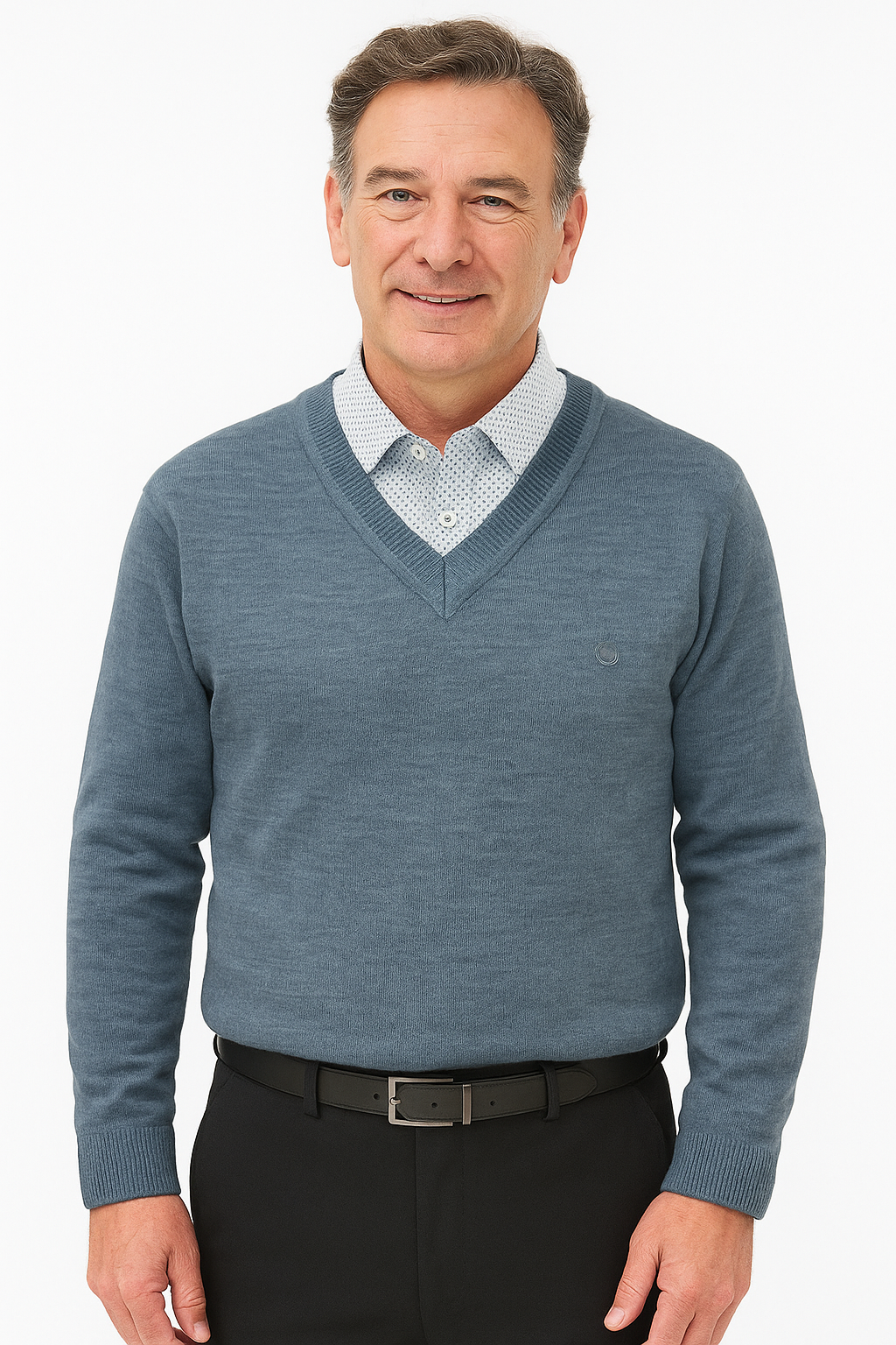 This elegant V-neck jumper from Zazzi combines timeless style with modern comfort. Crafted from a soft, fine-knit fabric in a versatile blue-grey shade, it’s perfect for layering over a shirt for a polished, smart-casual look. The jumper features a subtle embroidered Zazzi logo on the chest and ribbed detailing at the neckline, cuffs, and hem for a refined finish. Ideal for both work and weekend wear, it offers a comfortable modern fit and a touch of sophistication for any occasion.