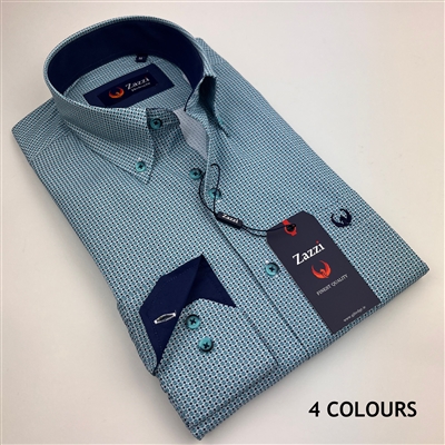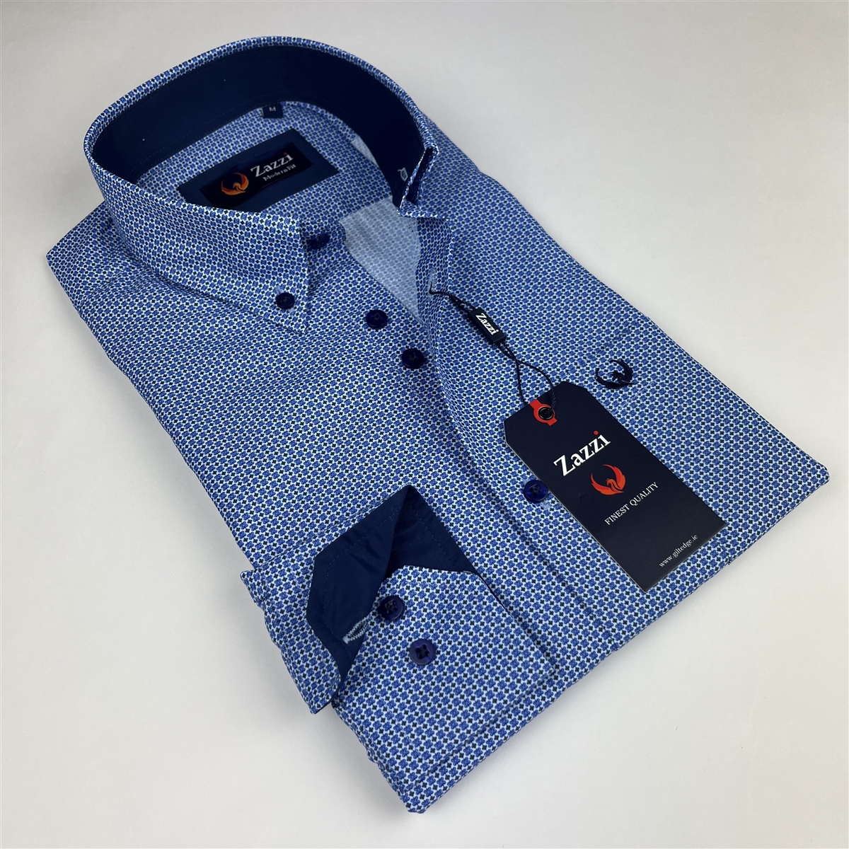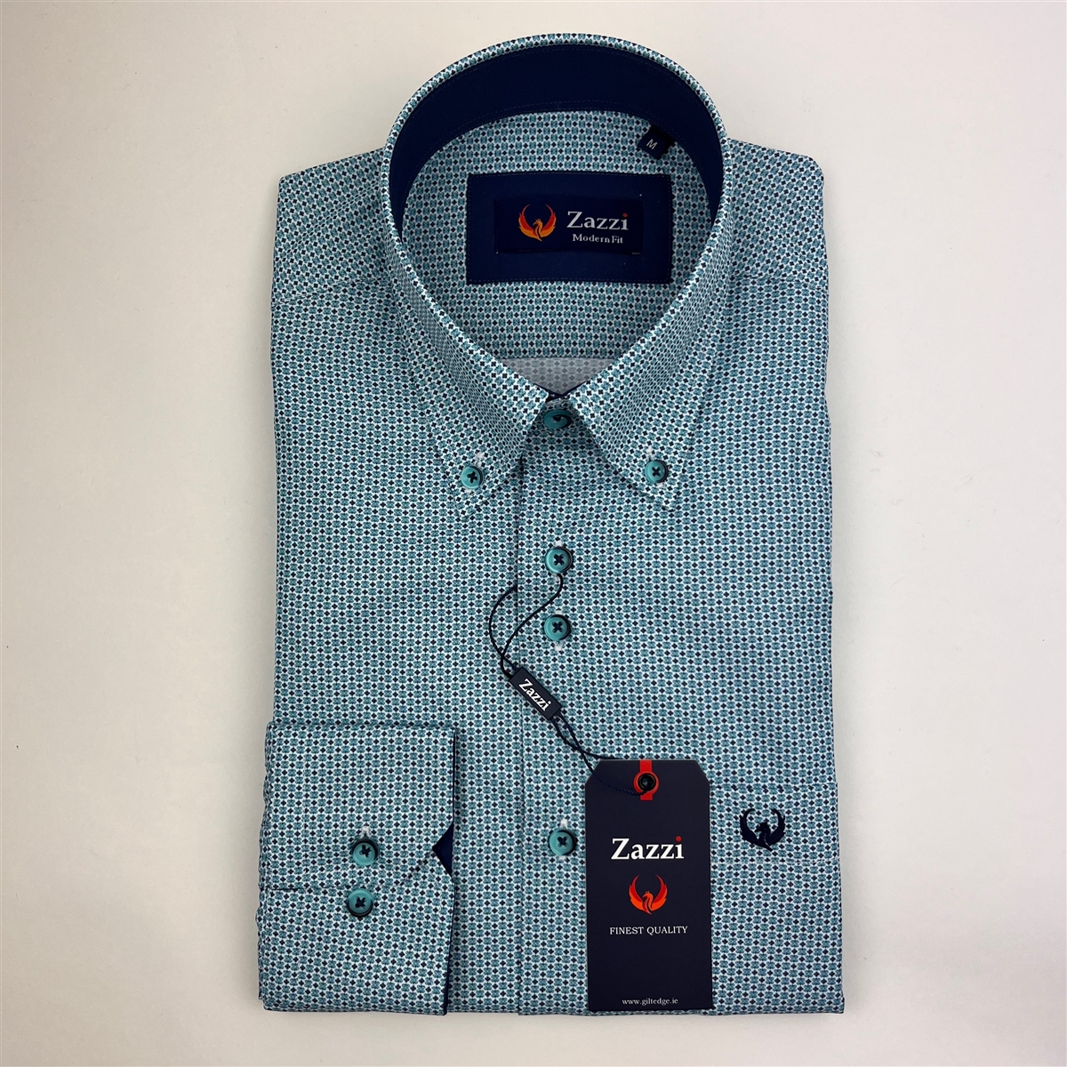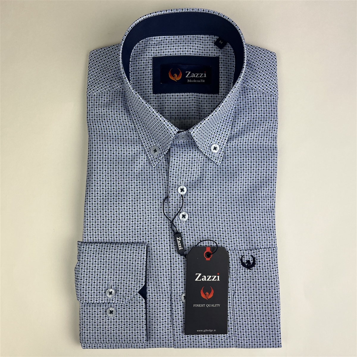 This Zazzi shirt features a modern fit with a smart button-down collar and a subtle all-over geometric pattern in soft colours and navy tones. It’s made from a smooth, lightweight fabric that feels comfortable to wear while still looking sharp. The contrast inner collar adds a stylish touch, and the matching buttons keep the look neat and polished. Ideal for both work and evenings out.